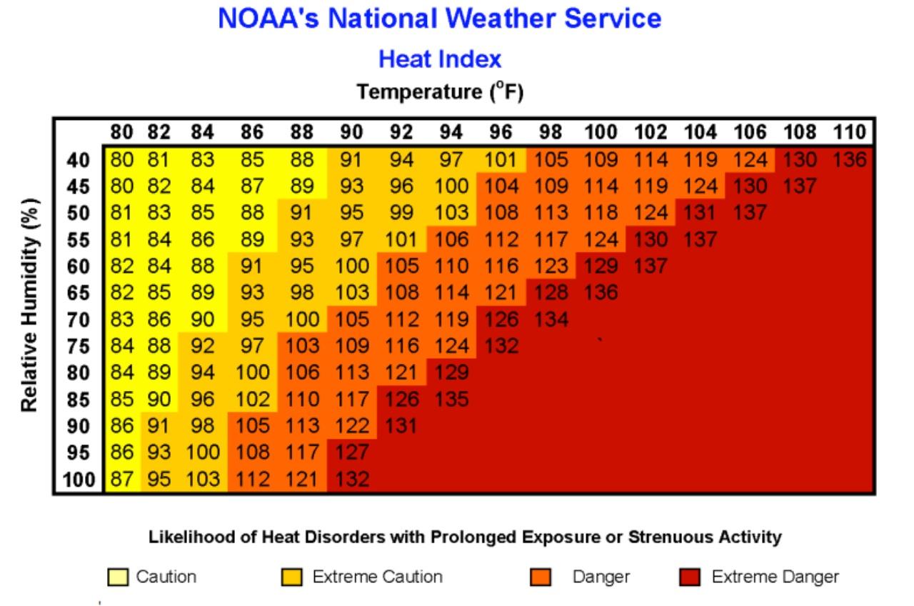 Heat Index หรือ ตารางดัชนีความร้อน (เทียบอุณหภูมิความร้อน กับความชื้น) ที่ส่งผลต่อความปลอดภัยในการใช้ชีวิตของมนุษย์