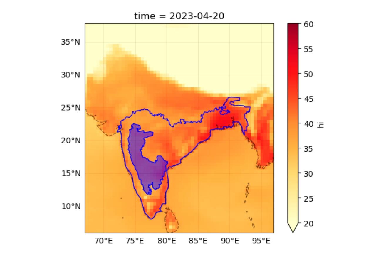 ภาพที่ 1 : อุณหภูมิเฉลี่ย 4 วัน ในอินเดียและบังกลาเทศ พบว่าอากาศแห้ง และมีลักษณะภูมิอากาศกึ่งแห้งแล้งเป็นเงาฝน ตามแนวทิศตะวันตกของอินเดีย เกิดจากการสะสมความชื้นและความร้อนที่สูง