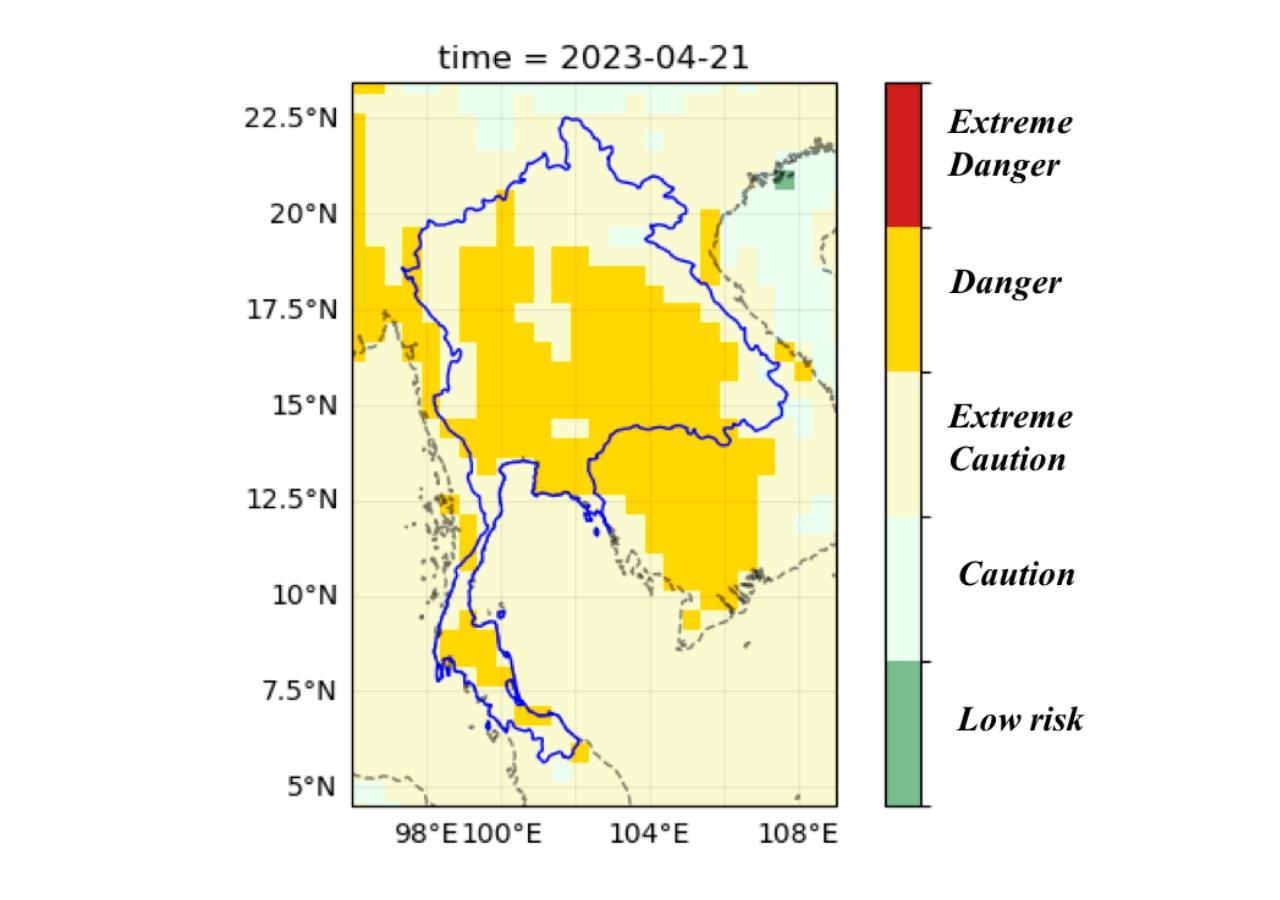 ภาพที่ 4 : แผนที่จำแนกอุณหภูมิกับระดับความร้อนที่กระทบต่อการดำรงชีวิต พบว่าคลื่นความร้อนปกคลุมประเทศไทยในระดับอันตราย ในช่วงวันที่ 18-21 เมษายน 2566 ที่ผ่านมา