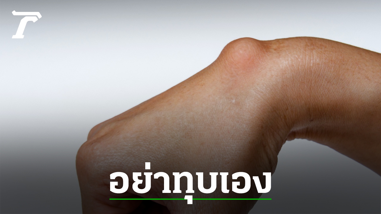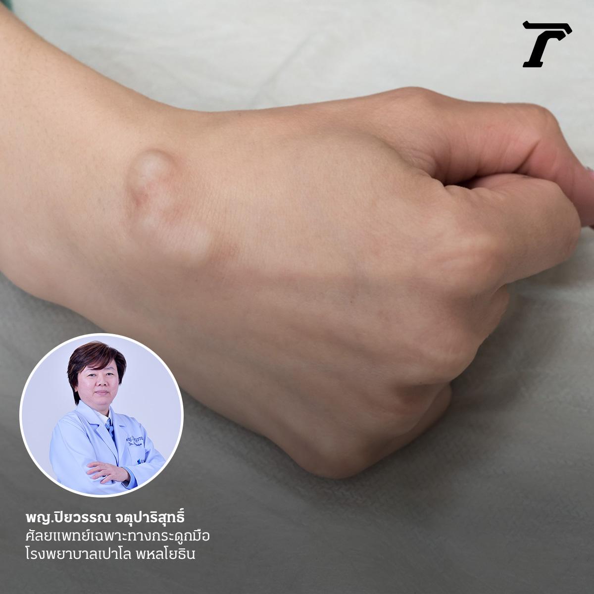 “ถุงน้ำในข้อมือ” ถุงน้ำในข้อมือเป็นอาการกวนใจ ที่ดูไม่อันตราย ไม่เจ็บมาก ยุบเองได้ แต่ผู้ที่เป็นมักกังวลใจ ไม่รู้ว่ามันคืออะไร เวลาใช้งานข้อมือก็จะลำบาก ลักษณะของถุงน้ำมีทางเชื่อมให้น้ำในข้อไหลออกมา ปูดเป็นลูกโป่งรบกวนท่าทางใช้งาน แต่ในคลิปที่ทำชาเลนจ์ใช้ของแข็งทุบนั้น ส่วนใหญ่คนทุบจะต้องเป็นคนอื่น ถ้าเราทุบเอง แรงอาจจะไม่พอ ไม่แตก แต่หมอก็ไม่แนะนำให้ทำ