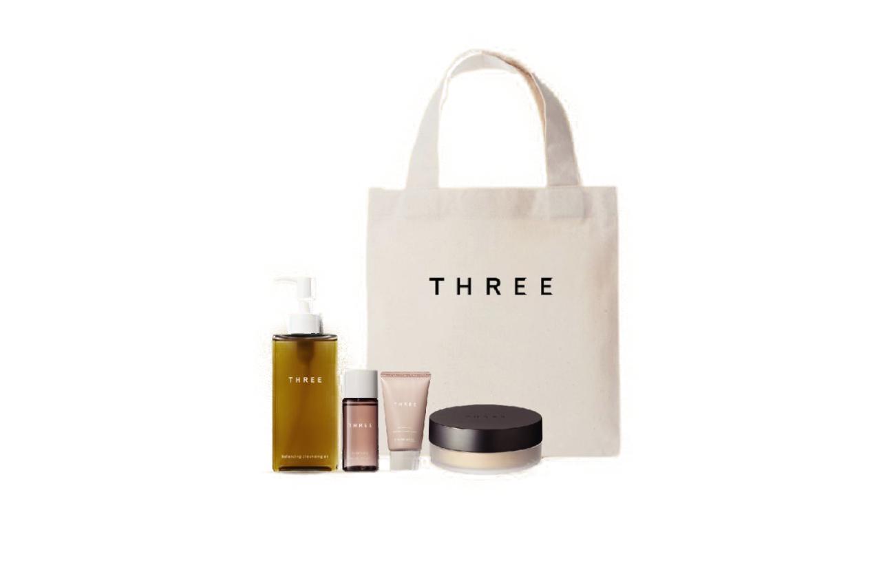 เซตผลิตภัณฑ์ดูแลผิวจาก THREE ประกอบไปด้วยผลิตภัณฑ์บำรุงที่ช่วยให้ผิวดูกระจ่างใส ในเซตมี 2 ผลิตภัณฑ์ยอดฮิตของแบรนด์คือ THREE Advanced Ethereal Smooth Operator Loose Powder แป้งฝุ่นเนื้อละเอียด บางเบา อุดมไปด้วยสารบำรุงผิว และ Balancing Cleansing Oil ออยล์ที่ช่วยลบเครื่องสำอางบนใบหน้าได้อย่างสะอาดหมดจด นอกจากนี้ยังมีผลิตภัณฑ์ขนาดทดลองอื่นๆ และกระเป๋าผ้ามาให้สะสมอีกด้วย