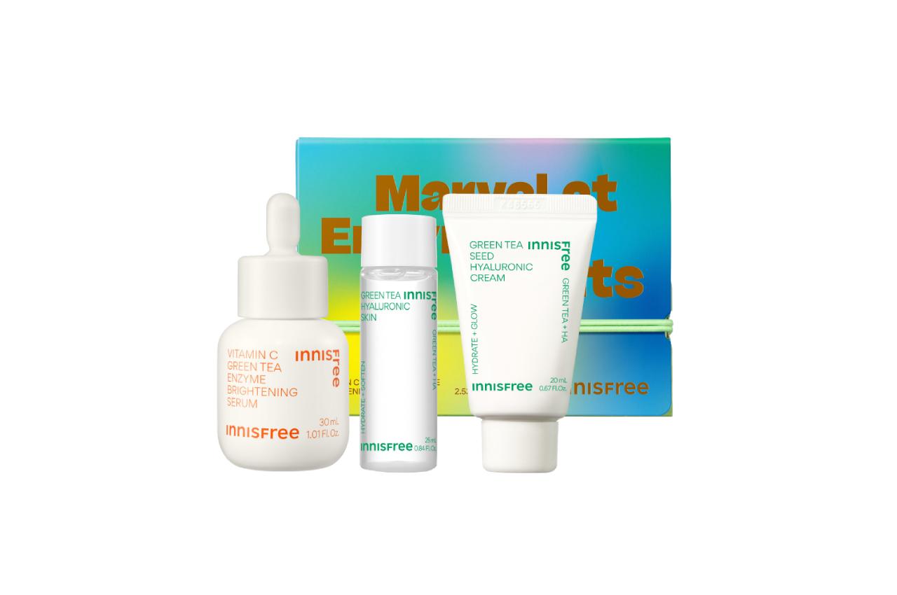 แบรนด์สกินแคร์เกาหลีอย่าง Innisfree จัดชุดของขวัญสุดพิเศษส่งท้ายปี 2023 ด้วยเช่นกัน ในเซตประกอบด้วย Vitamin C Green Tea Enzyme Brightening Serum เซรั่มบำรุงผิวที่มีส่วนผสมของวิตามินซีและเอนไซม์จากชาเขียวเกาะเชจู ช่วยลดปัญหาจุดด่างดำและความหมองคล้ำ ให้ผิวดูกระจ่างใสขึ้น นอกจากนี้ยังมี Green Tea Hyarulonic Skin และ Green Tea Hyarulonic Cream ช่วยบำรุงผิวให้ชุ่มชื้นด้วย