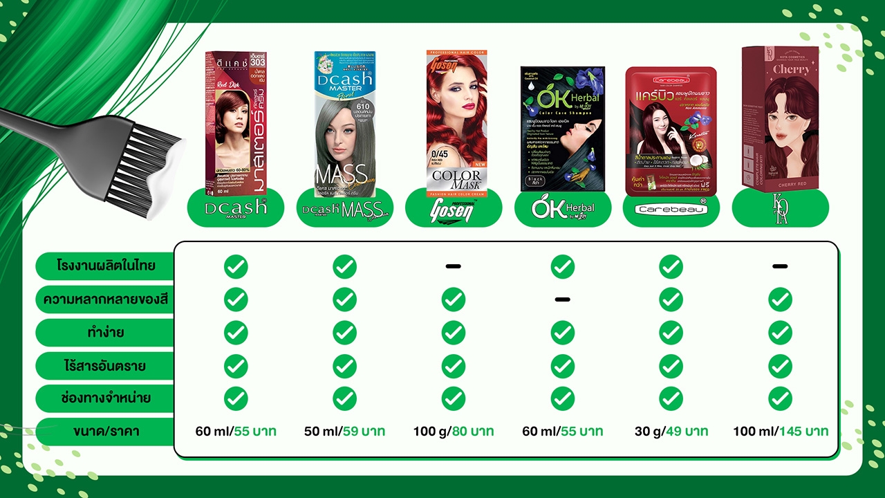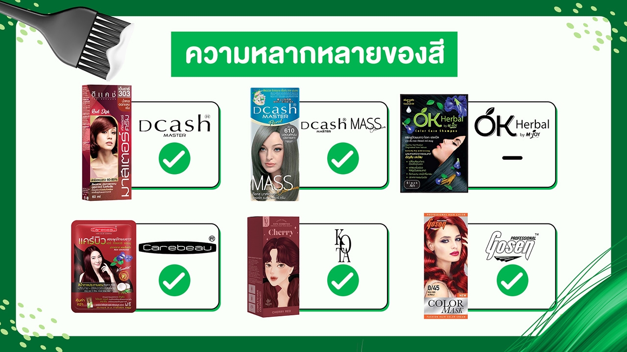2. ความหลากหลายของสี : เรื่องของความหลากหลายของสีก็เป็นส่วนสำคัญในการตัดสินใจเลือก เชื่อว่าหลายคนก็อยากได้ยาย้อมผมที่มีให้เลือกหลากหลายสีเพื่อที่จะไม่ต้องไปผสมสีเองให้ยุ่งยาก