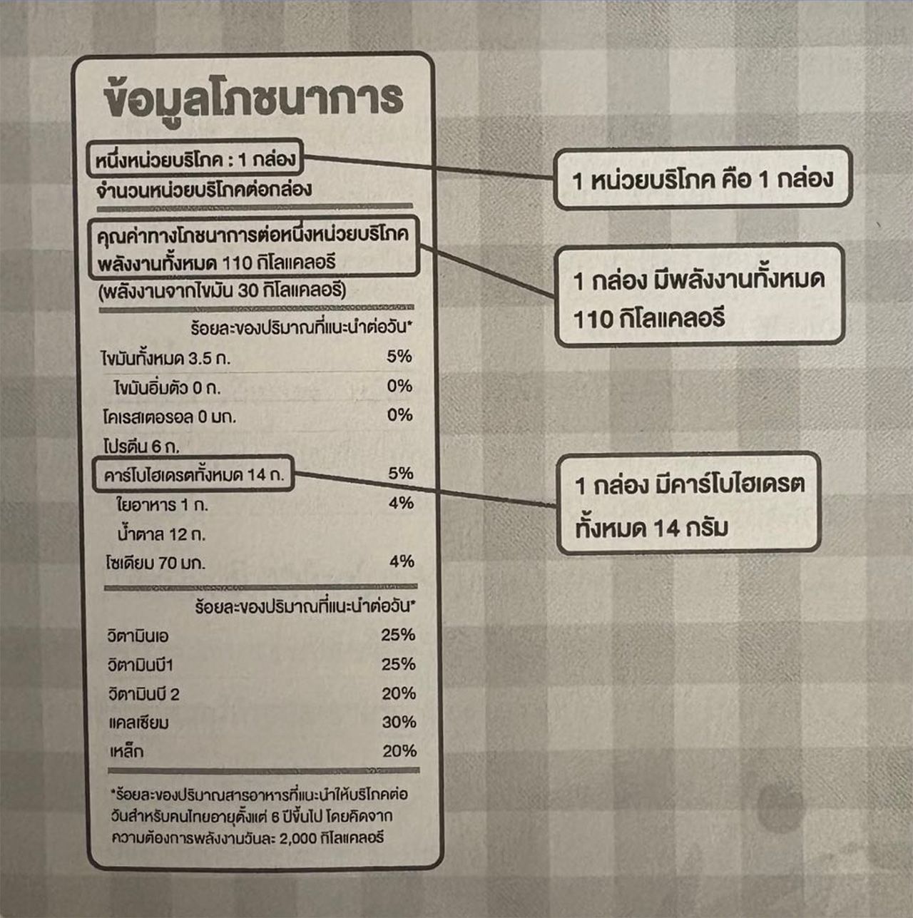● คุณค่าทางโภชนาการต่อ 1 หน่วยบริโภค หมายถึง เมื่อเรากินอาหารตามปริมาณที่ระบุใน 1 หน่วยบริโภคแล้วจะได้พลังงานเท่าใด สารอาหารอะไรบ้าง ในปริมาณเท่าใด และปริมาณนี้คิดเป็นร้อยละเท่าไรของปริมาณที่เราควรได้รับต่อวัน