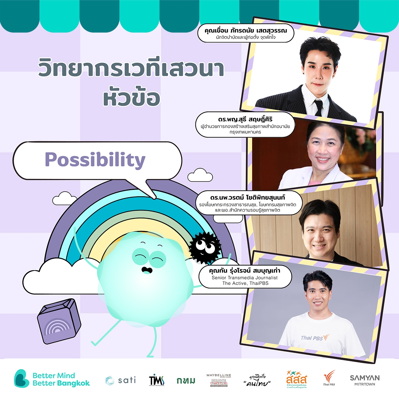 Possibility : ความเป็นไปที่เราจะกล้าฝันถึงนโยบายด้านสุขภาพจิตที่ตอบโจทย์สังคมเมือง ร่วมจินตนาการถึงอนาคตที่การดูแลสุขภาพจิตมีความทั่วถึง เข้าถึงได้ และให้ความสำคัญกับผู้คนเป็นศูนย์กลาง ผู้ร่วมเสวนา ประกอบด้วย