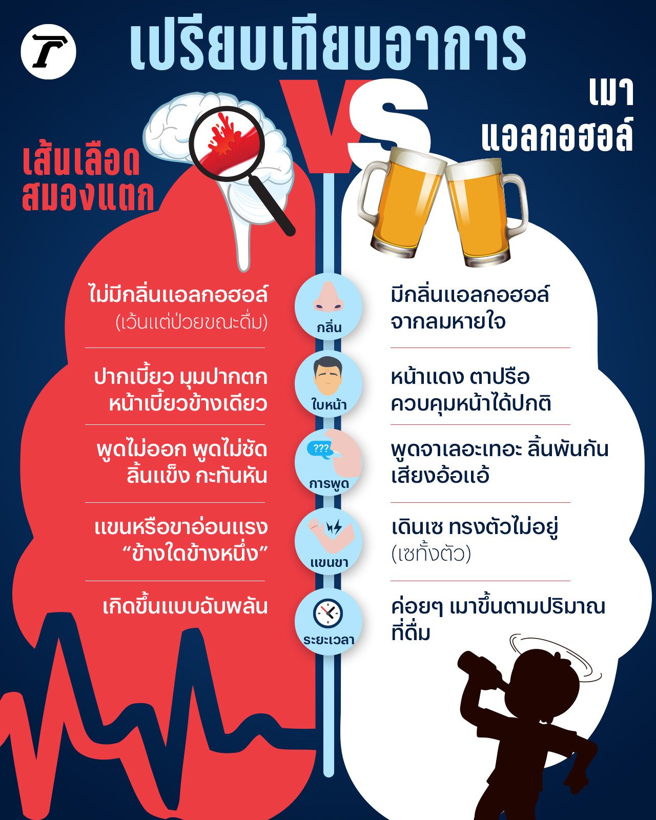 จากกรณีข่าวสะเทือนใจ หนุ่มเส้นเลือดสมองแตกขับรถชน แต่ถูกเข้าใจผิดว่า “เมา” จนถูกใส่กุญแจมือและเสียโอกาสในการรักษาอย่างทันท่วงที กลายเป็นคำถามสำคัญในสังคมว่า อาการของโรคสโตรกกับคนเมาเหล้านั้นแตกต่างกันอย่างไร? ไทยรัฐออนไลน์พาไปเจาะลึกสัญญาณเตือนที่ต้องระวัง เพราะวินาทีที่เสียไปคือชีวิตของผู้ป่วย
