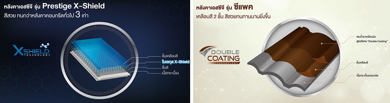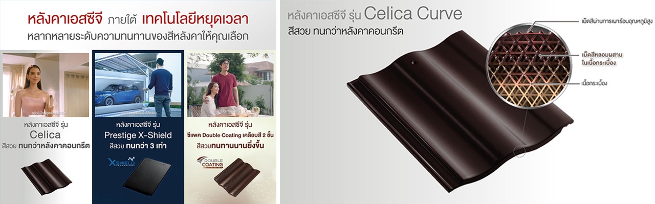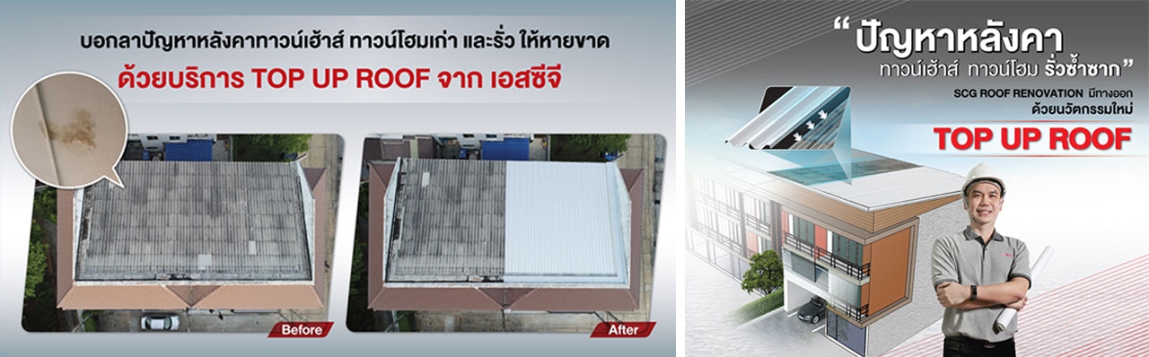 - โซลูชั่น “ไร้กังวล” เพื่อลูกค้าทาวน์เฮ้าส์และทาวน์โฮม ที่มีปัญหาหลังคาเก่ารั่วซ้ำซาก ด้วยนวัตกรรม Top Up Roof จาก SCG Roof Renovation ด้วยการเสริมวัสดุมุงหลังคาปิดจุดรั่ว แบบ Double Protection ลิขสิทธิ์หนึ่งเดียวจากเอสซีจี โดยไม่ต้องรื้อหลังคาเก่าออก ช่วยลดการเกิดฝุ่นจากการทำงาน ในขณะที่เจ้าของบ้านสามารถอาศัยอยู่ในบ้านได้ตามปกติ และมั่นใจด้วยการรับประกันการติดตั้งนาน 1 ปี พร้อมนำเทคโนโลยีดิจิทัลเพิ่มความสะดวกในการสำรวจหลังคา เจ้าของบ้านสามารถประมาณการราคาด้วยภาพถ่ายดาวเทียมด้วยตนเองในเบื้องต้น เพียงเข้าเว็บไซต์ https://raes.scg.com และเจาะลึกการสำรวจหน้างานด้วยเทคโนโลยีโดรนที่ช่วยให้เห็นสภาพหลังคาตลอดจนทำการวิเคราะห์และประมาณการหาโซลูชั่นที่เหมาะสมได้อย่างรวดเร็ว ทั้งนี้ ในส่วนของ “สินค้า” เอสซีจี ได้พัฒนาการแก้ปัญหากระเบื้องหลังคาสีซีดจาง ด้วย “เทคโนโลยีหยุดเวลา” ของกระเบื้องหลังคาที่มีหลากหลายระดับความทนทานของสี เพื่อหลังคาสีสวยทนนาน อาทิ หลังคาเอสซีจี รุ่น Celica Curve หลังคาคอนกรีต เอสซีจี รุ่น Prestige X-Shield และหลังคาคอนกรีต เอสซีจี รุ่น ซีแพค