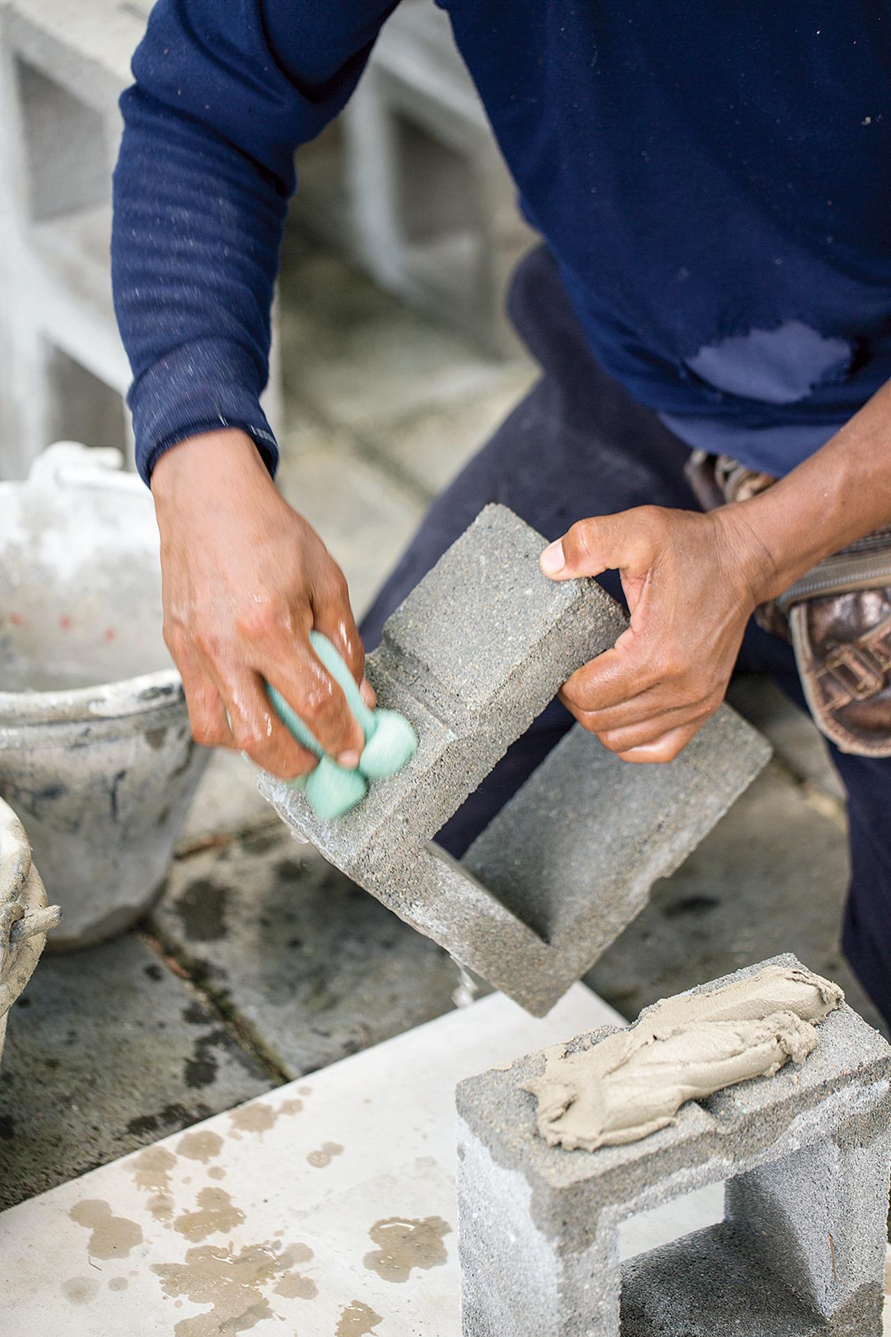 Step2 ใช้ฟองน้ำชุบน้ำเช็ดบล็อกคอนกรีตชั้นที่สองให้ทั่ว เพื่อป้องกันการดูดซับน้ำจากปูน