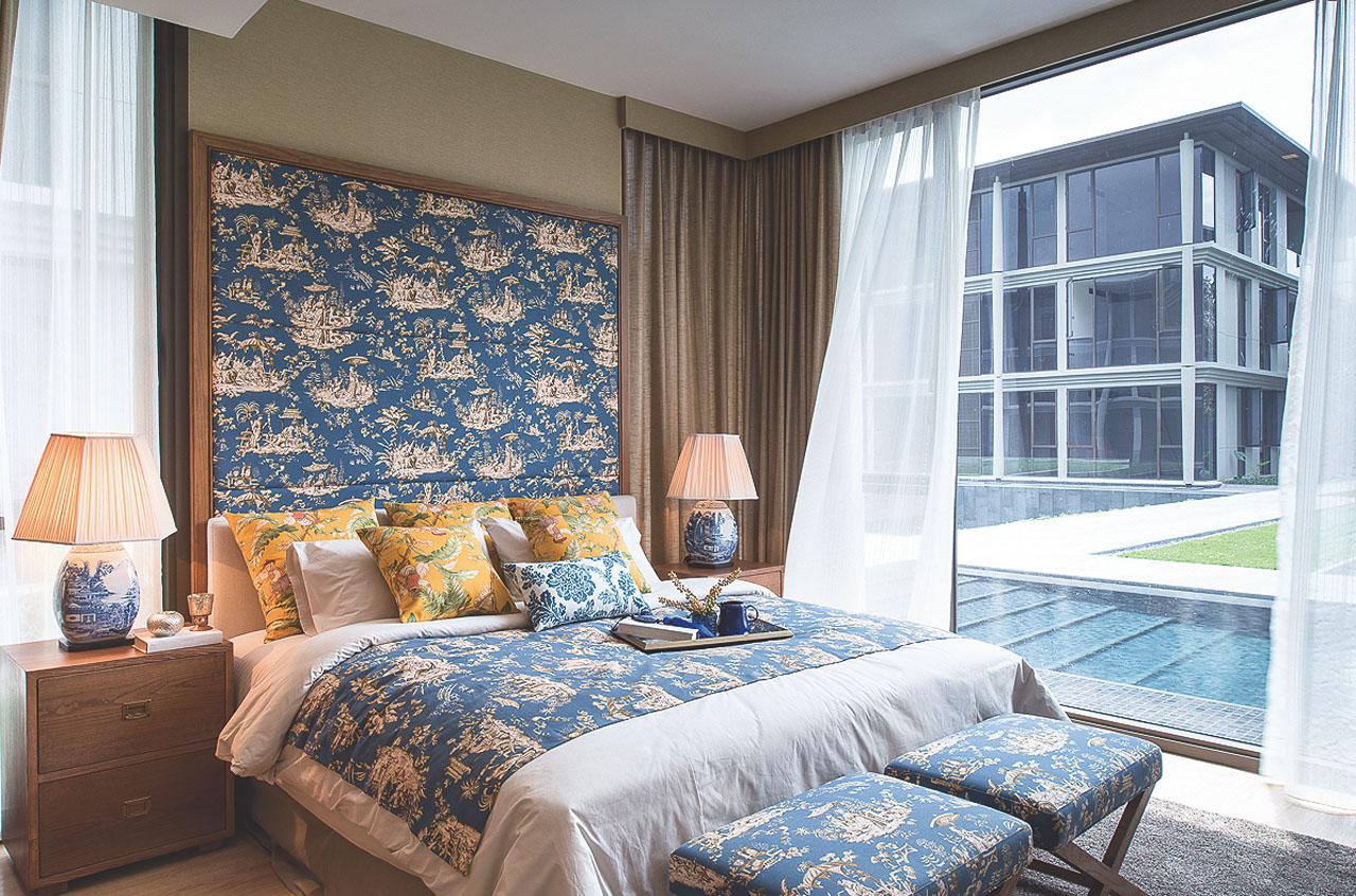 บริเวณหัวเตียงกรุวอลล์เปเปอร์ลาย Toile สีน้ำเงิน ใช้ตัดสลับกับของตกแต่งอย่างปลอกหมอนสีเหลืองสด ซึ่งเป็นสีคู่ตรงข้ามที่นำมาใช้ด้วยกันแล้วดูโดดเด่น ทำให้ห้องมีเอกลักษณ์และดูสดชื่นด้วย