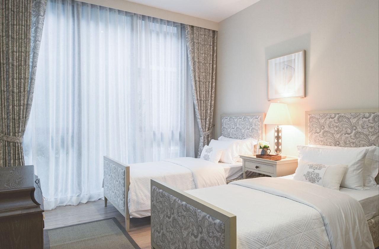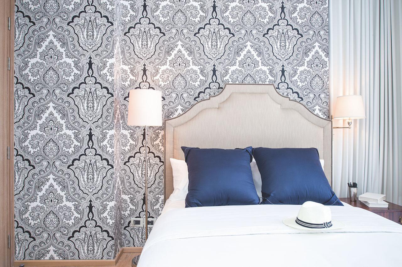 ผนังด้านหลังหัวเตียงกรุลวดลาย Damask สีขาวดำ ซึ่งมีลายขนาดใหญ่ เมื่อนำมาใช้คู่กับเตียงสไตล์คอนเทมโพรารี ที่ตรงหัวเตียงมีรายละเอียดโค้งมนตัดกับสีน้ำเงินของปลอกหมอน ก็ดูสวยหรูหรา