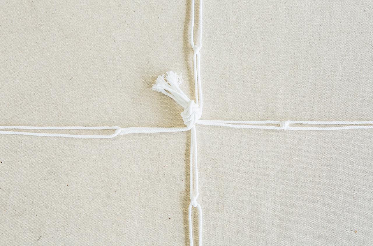 3.แบ่งเชือกออกเป็นสี่คู่แล้วกางออกให้ได้สี่มุมเพื่อไม่ให้เชือกพันกัน ผูกปมที่เชือกแต่ละคู่ให้แน่น