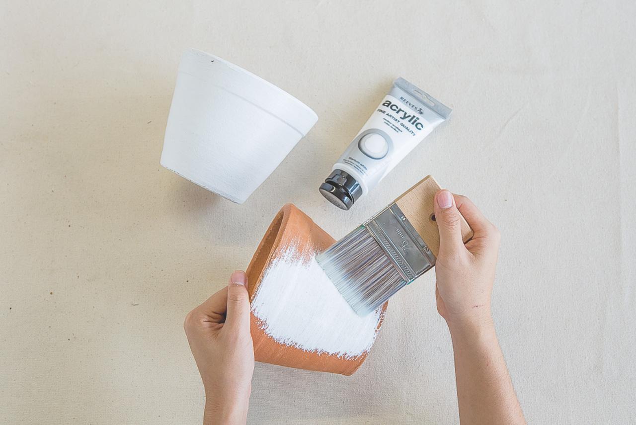 5. ทาสีอะคริลิกให้ทั่วกระถางอย่างน้อยสองรอบโดยปาดสี ไปในทางเดียวกันเพื่อให้เนื้อสีเรียบเนียนสม่ำเสมอ ทิ้งไว้ให้แห้งแล้วนำต้นไม้ลงปลูก