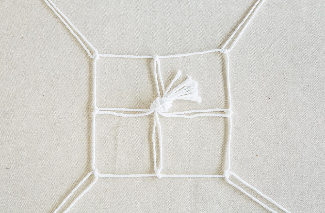 4. แบ่งเชือกออกเป็นสี่คู่อีกครั้ง แต่จับคู่แบบสลับกับขั้นตอนที่ 3 แล้วผูกปมที่เชือกแต่ละคู่ให้แน่นเช่นเดียวกัน