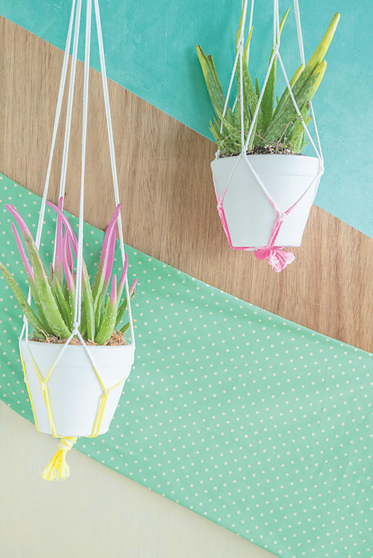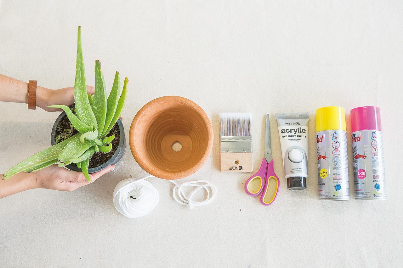 6. เพิ่มลูกเล่นให้เชือกดูน่าสนใจด้วยการพ่นสีไล่เฉดจากเข้มไปอ่อน หรือพ่นสลับสองสีก็น่ารักไปอีกแบบ เมื่อสีแห้งจึงนำกระถางต้นไม้มาจัดวางและผูกปมปลายเชือกด้านที่เหลือเพื่อทำที่แขวน