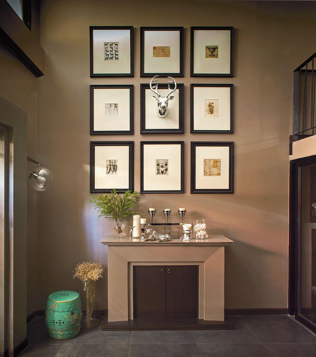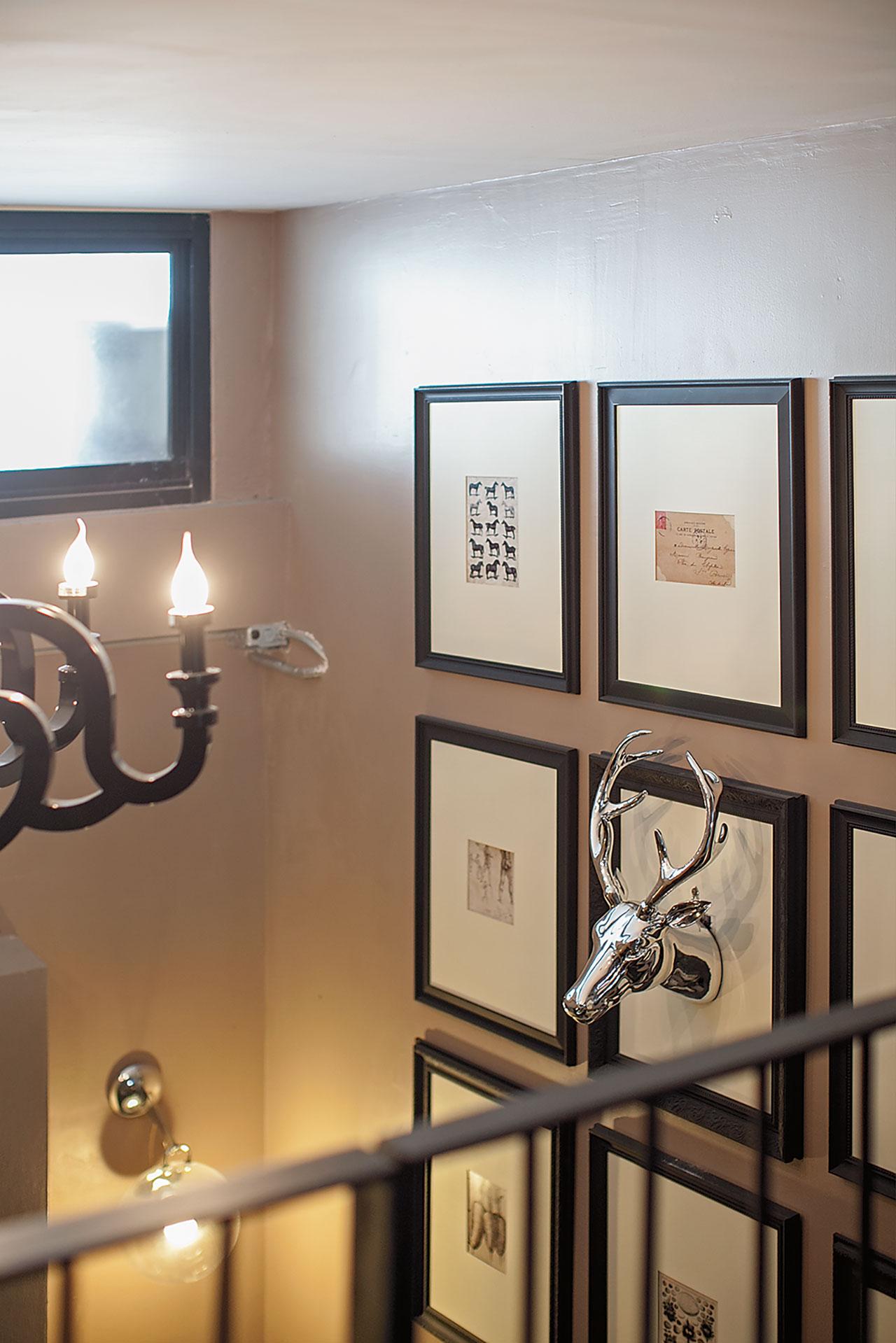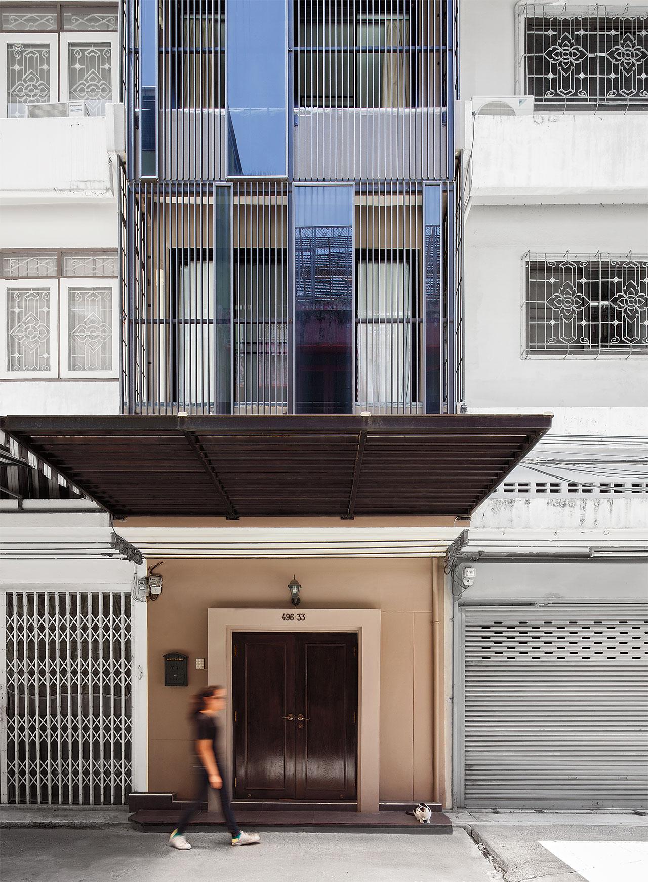 ในซอยที่เรียงรายด้วยตึกแถวรุ่นเก่าหลายคูหา มีเพียงตัวอาคารของคุณจ้าและคุณหลิงที่ดึงดูดสายตาเราแต่แรกเห็นด้วยฟาเซดระแนงอะลูมิเนียมสลับแผ่นกระจก ประตูทางเข้าแบบบานคู่สุดคลาสสิกเปิดเข้าไปสู่บรรยากาศสไตล์ยุโรป บริเวณโถงทางเข้าที่ตกแต่งด้วยกรอบรูปหัวกวาง เตาผิงจำลอง งานเหล็กดัด ตลอดจนโทนสีเข้มแต่อบอุ่นภายใต้พื้นที่แสนกะทัดรัด