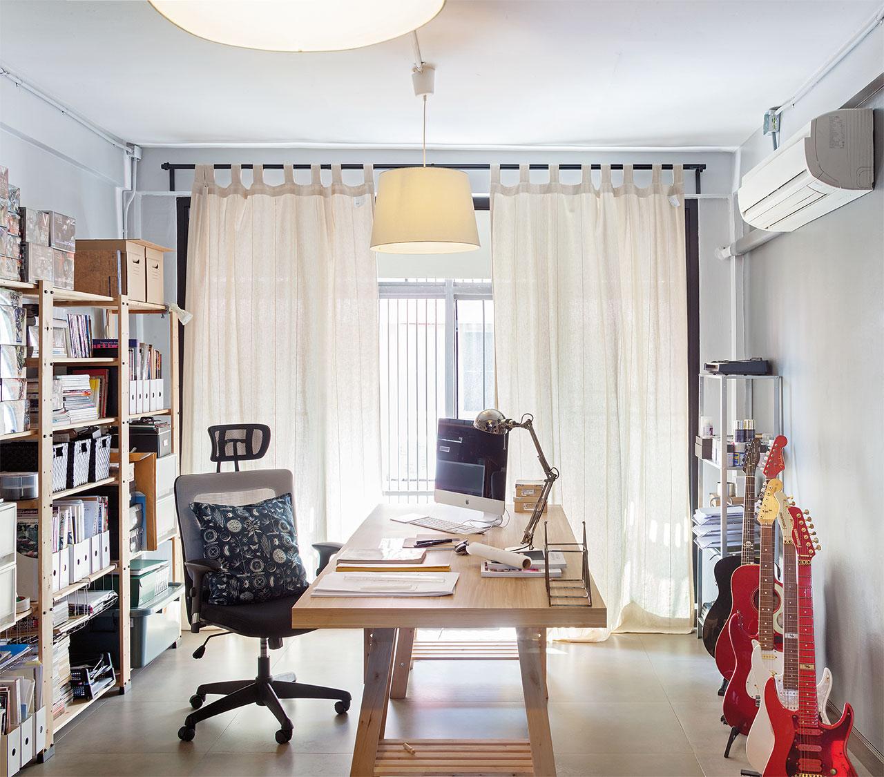 “มุมนั่งเล่นในห้องทำงานคือมุมโปรดที่เราชอบใช้เวลาด้วยกัน หลังเลิกงานผมกับภรรยาจะมานั่งเล่นดูทีวีตรงนี้ คอนเซปต์การออกแบบเน้นถูกแต่ฟังก์ชั่นครบ เนื่องจากลงทุนกับชั้นอื่นไปเยอะแล้ว (หัวเราะ) ที่นี่เหมือนเป็นห้องที่เกิดขึ้นเพื่อตอบโจทย์การใช้ชีวิตจริงๆ เช่น โต๊ะทำงานสั่งทำท็อปใหม่ เพราะอาชีพของเราถ้าใช้โต๊ะเล็กๆ คงทำงานไม่ได้แน่ๆ เพราะต้องเขียนแบบดูแบบในกระดาษแผ่นใหญ่ๆ ด้านหลังจัดวางชั้นสำหรับเก็บอุปกรณ์ทำงานและของสะสม เช่น โมเดลกันดั้ม หนังสือการ์ตูน แต่ก็แอบตกแต่งนิดหน่อยด้วยกรอบรูปและหัวกวางที่เราชอบซื้อเก็บไว้เวลาไปต่างประเทศ”