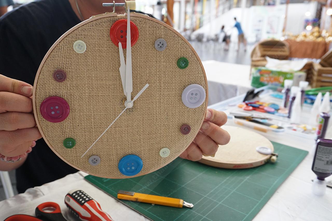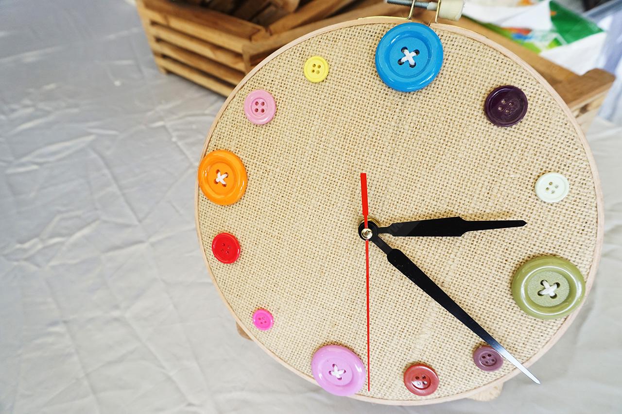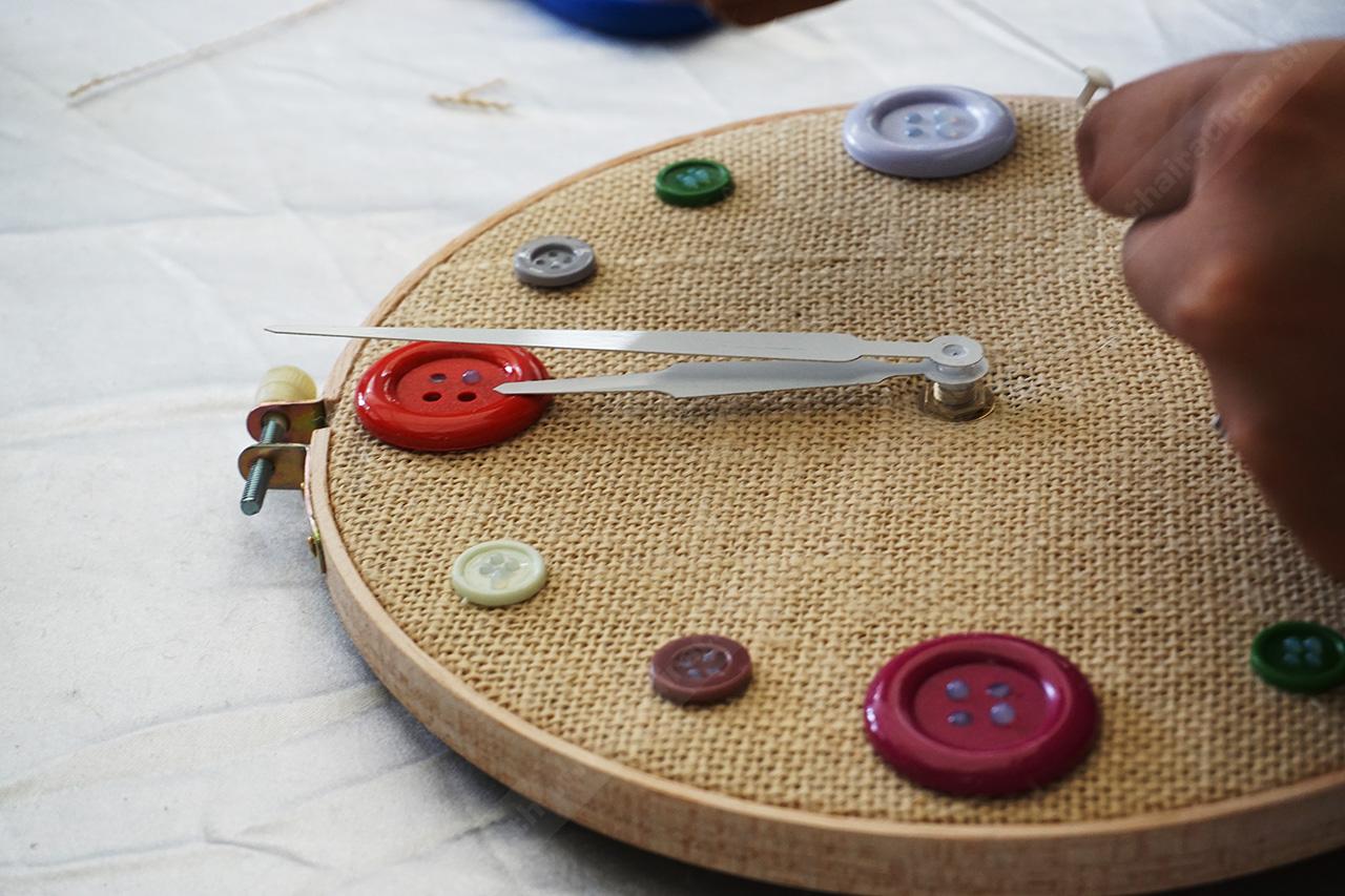 ติดตั้งเครื่องนาฬิกาให้เรียบร้อย ยึดติดด้วยกาว จากนั้นทากาวที่กระดุมพลาสติก แยกขนาดให้ชัดเจน เริ่มติดกระดุมรอบๆ ขอบริมสุดของวงสะดึง ใช้แทนตัวเลขของนาฬิกา