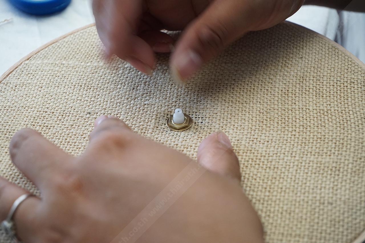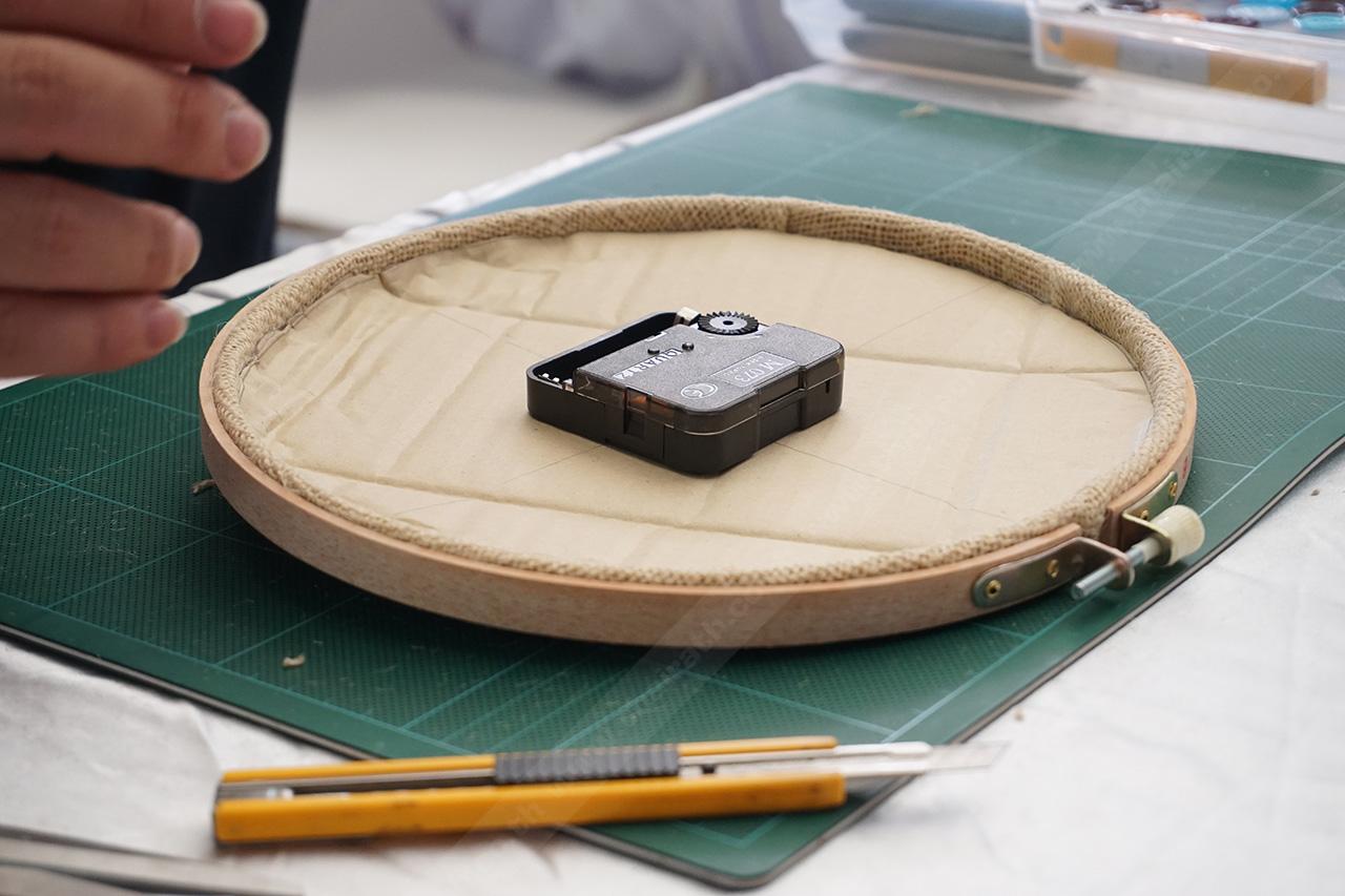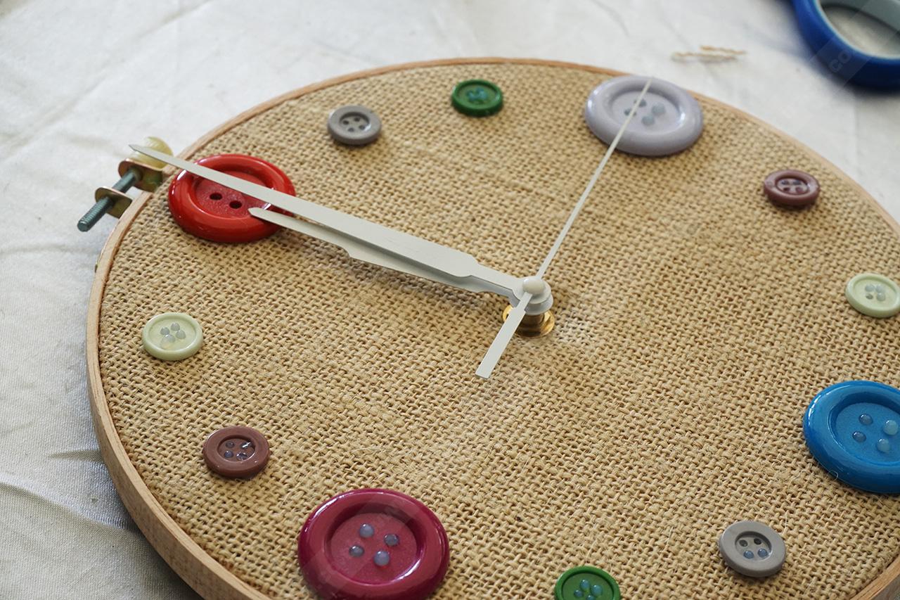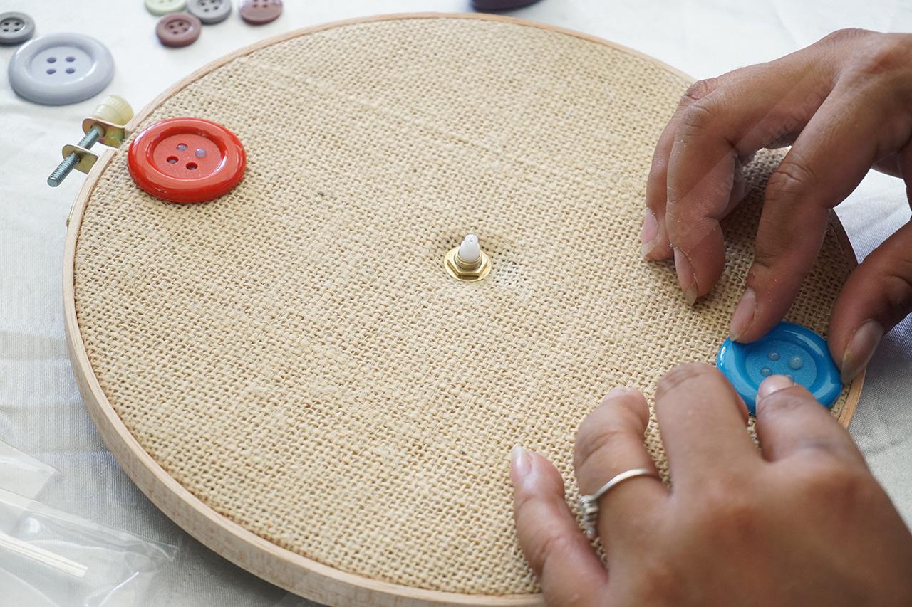 ติดตั้งเครื่องนาฬิกาให้เรียบร้อย ยึดติดด้วยกาว จากนั้นทากาวที่กระดุมพลาสติก แยกขนาดให้ชัดเจน เริ่มติดกระดุมรอบๆ ขอบริมสุดของวงสะดึง ใช้แทนตัวเลขของนาฬิกา