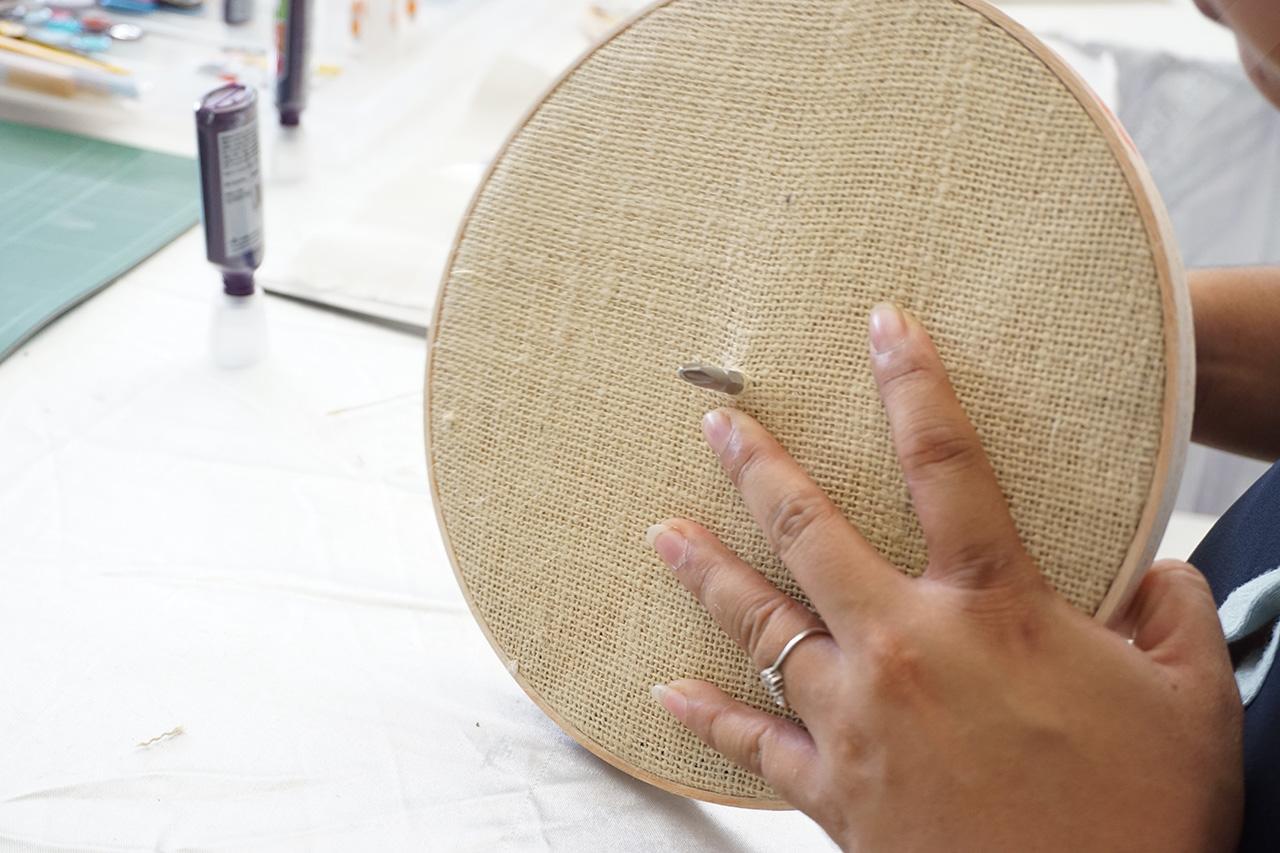 นำผ้ากระสอบตัดเป็นวงกลม ให้รัศมีวงมีขนาดใหญ่กว่าสะดึงประมาณ 1 นิ้ว จากนั้นนำมาสวมในไส้สะดึง แล้วครอบดึงให้ตึงแน่นดี จากนั้นคว่ำด้านหลัง แล้วเก็บริมผ้ากระสอบเข้าไปด้านใน ยึดติดผ้าให้แน่นด้วยกาวติดผ้า