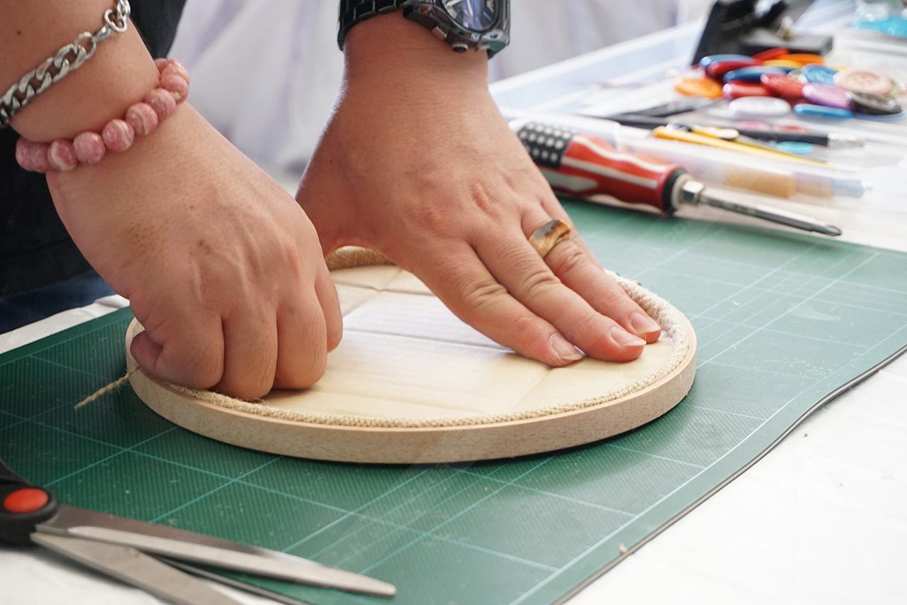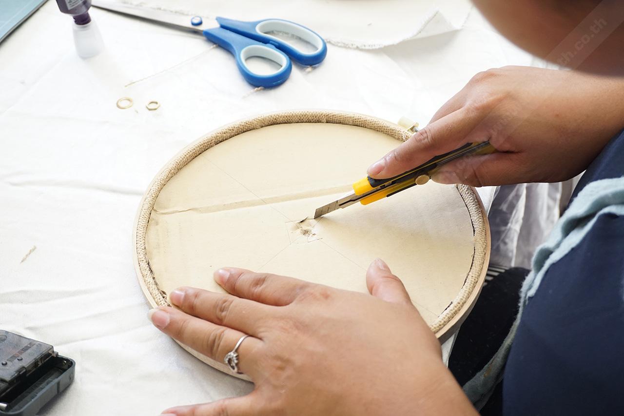 จากนั้นนำกระดาษลูกฟูก มาตัดเป็นวงกลมขนาดเส้นรัศมีเท่ากับวงของสะดึง จากนั้นทากาวแล้วติดทับลงไปด้านหลังให้แน่น