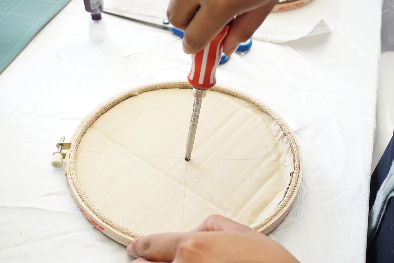 ใช้ดินสอกับไม้บรรทัด ลากเส้นจากขอบวงด้านหนึ่งไปจรดอีกด้านหนึ่ง จากนั้นลากอีกเส้นให้ตัดกัน เป็นลักษณะเครื่องหมายบวก จะเกิดจุดตัดตรงกลาง จากนั้นนำไขควงหัวแหลมมาเจาะรูให้ทะลุกระดาษและผ้ากระสอบ