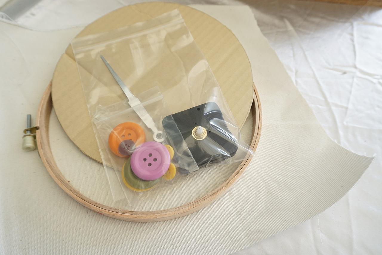 ขั้นแรก มาเตรียมอุปกรณ์กันก่อน ได้แก่ สะดึงไม้ หาซื้อง่ายๆ ตามร้านค้าออนไลน์ มีหลายขนาด ราคาตั้งแต่ 150-180 บาท นอกจากนี้ก็มี ผ้ากระสอบ, กระดาษลูกฟูก (ลังกระดาษ), กาวติดผ้า, ดินสอ, ไม้บรรทัด, ไขควง, กระดุมพลาสติกสีสันต่างๆ และที่ขาดไม่ได้คือ เครื่องนาฬิกาพร้อมเข็ม หาซื้อได้ตามตลาดคลองถม ราคาถูกดี มีตั้งแต่ราคา 30, 70, 90, 180 บาท แล้วแต่รุ่น