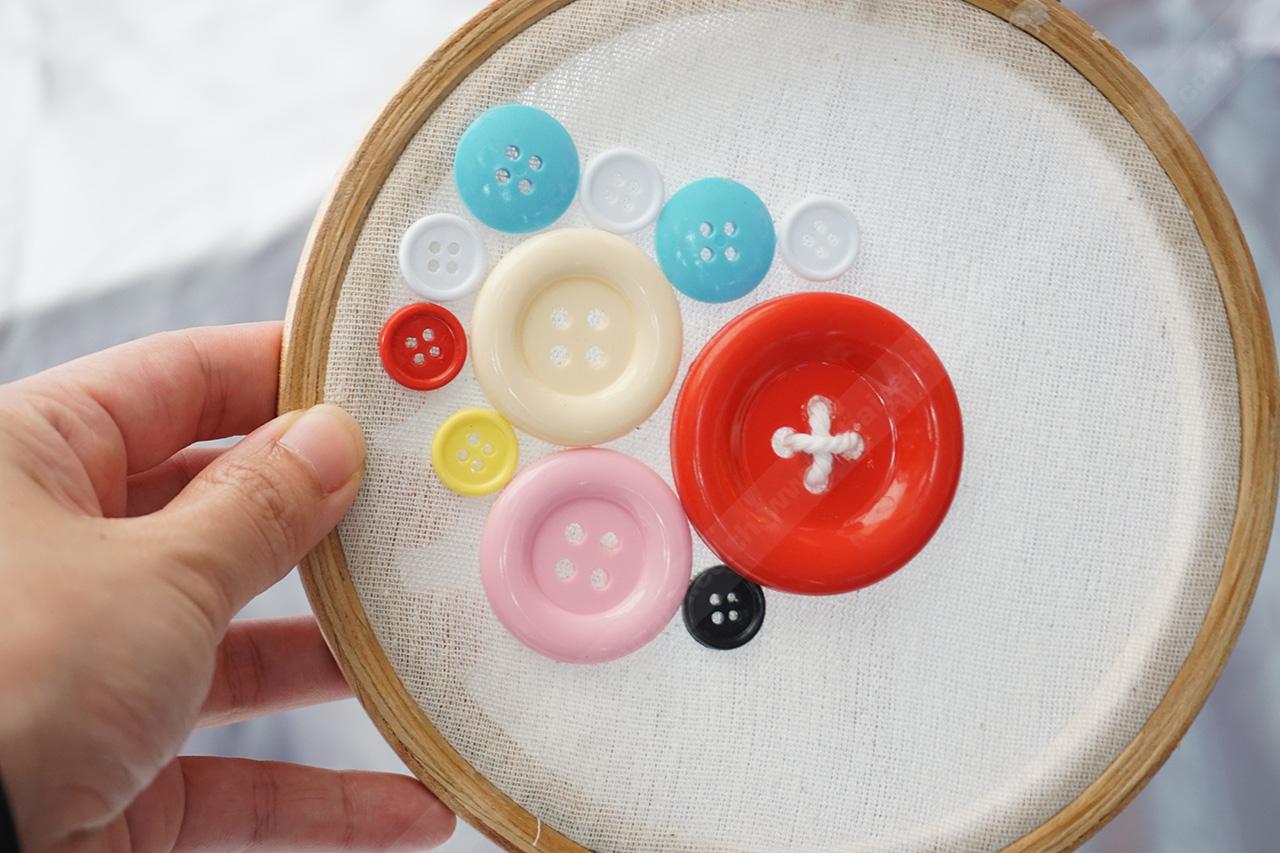 กระดุมเม็ดใหญ่ใช้แทนเลข 12, 6, 3, 9 ส่วนตัวเลขที่เหลือบนแป้นนาฬิกา แทนด้วยกระดุมเม็ดเล็กๆ อาจใช้ด้ายปักเม็ดกระดุมแทนการติดกาวก็ได้ ก็จะเพิ่มความน่ารักไปอีก