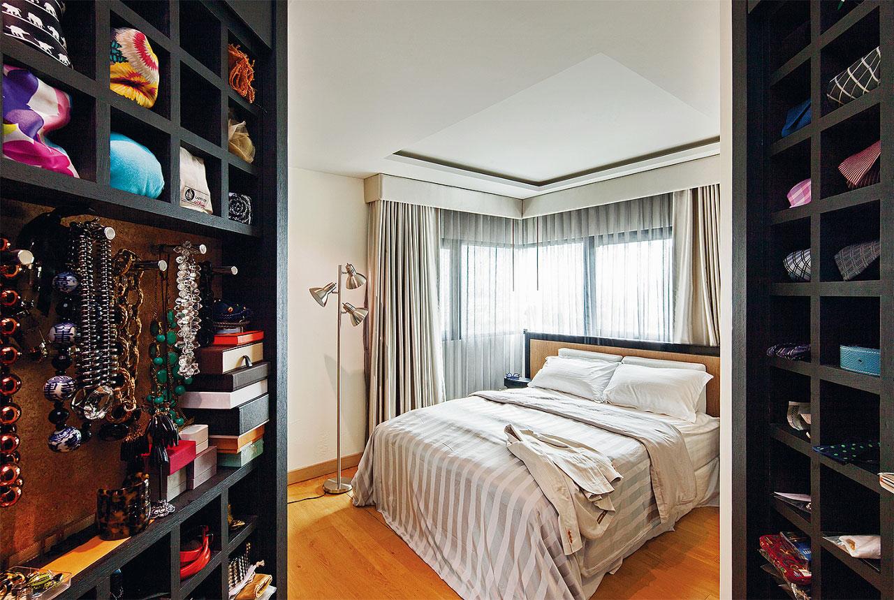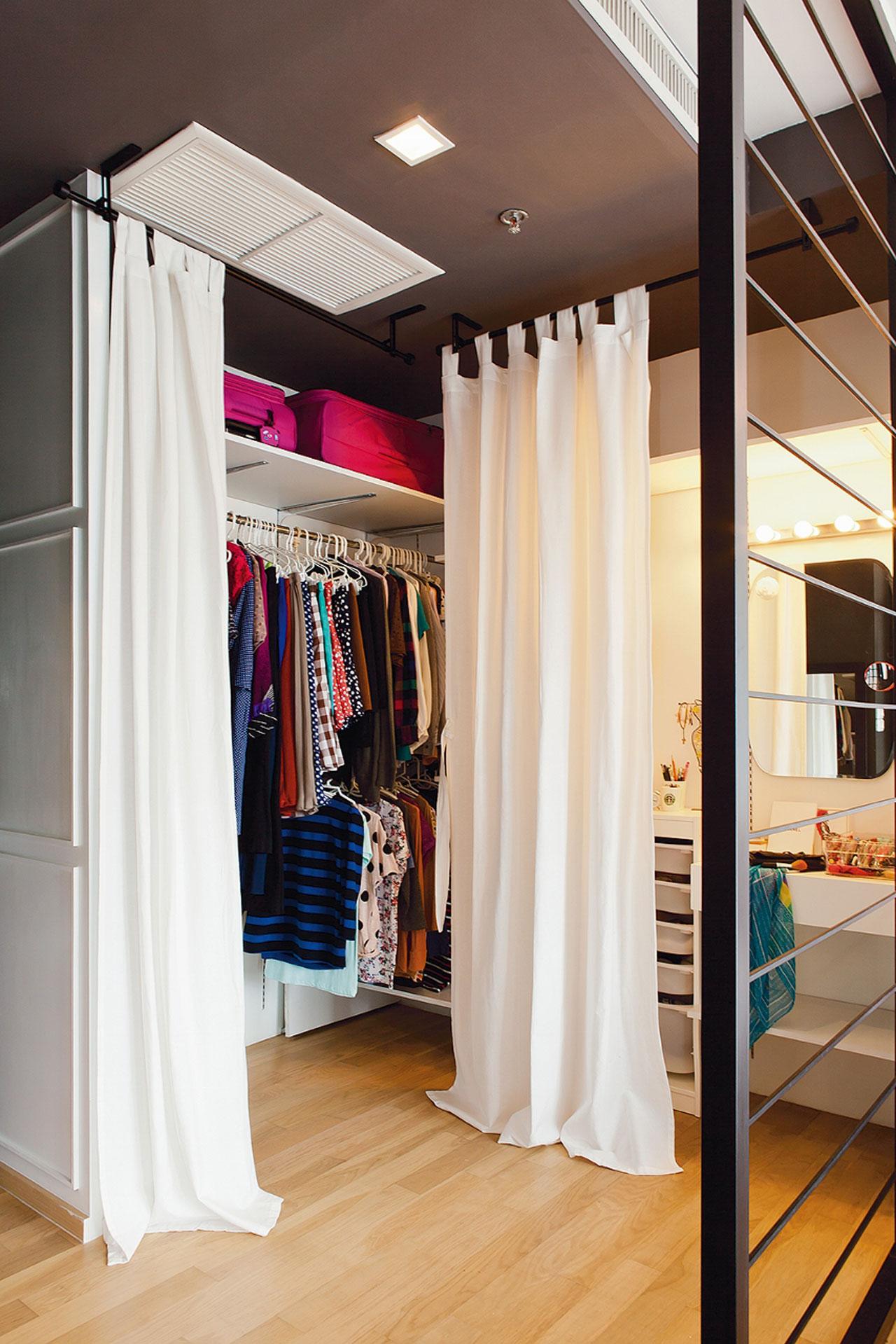 ไม่จำเป็นต้องปิดหน้าบานมิดชิด แต่จัดระเบียบและออกแบบชั้นวางให้ดี ใช้ผ้าและราวผ้าม่านแทนหน้าบานเปิดสำหรับแยกส่วนระหว่างจัดเก็บเสื้อผ้ากับส่วนแต่งตัว ส่วนพวกกระเป๋าเดินทางควรเก็บไว้ด้านบนสุด เพราะไม่ได้ใช้งานบ่อย