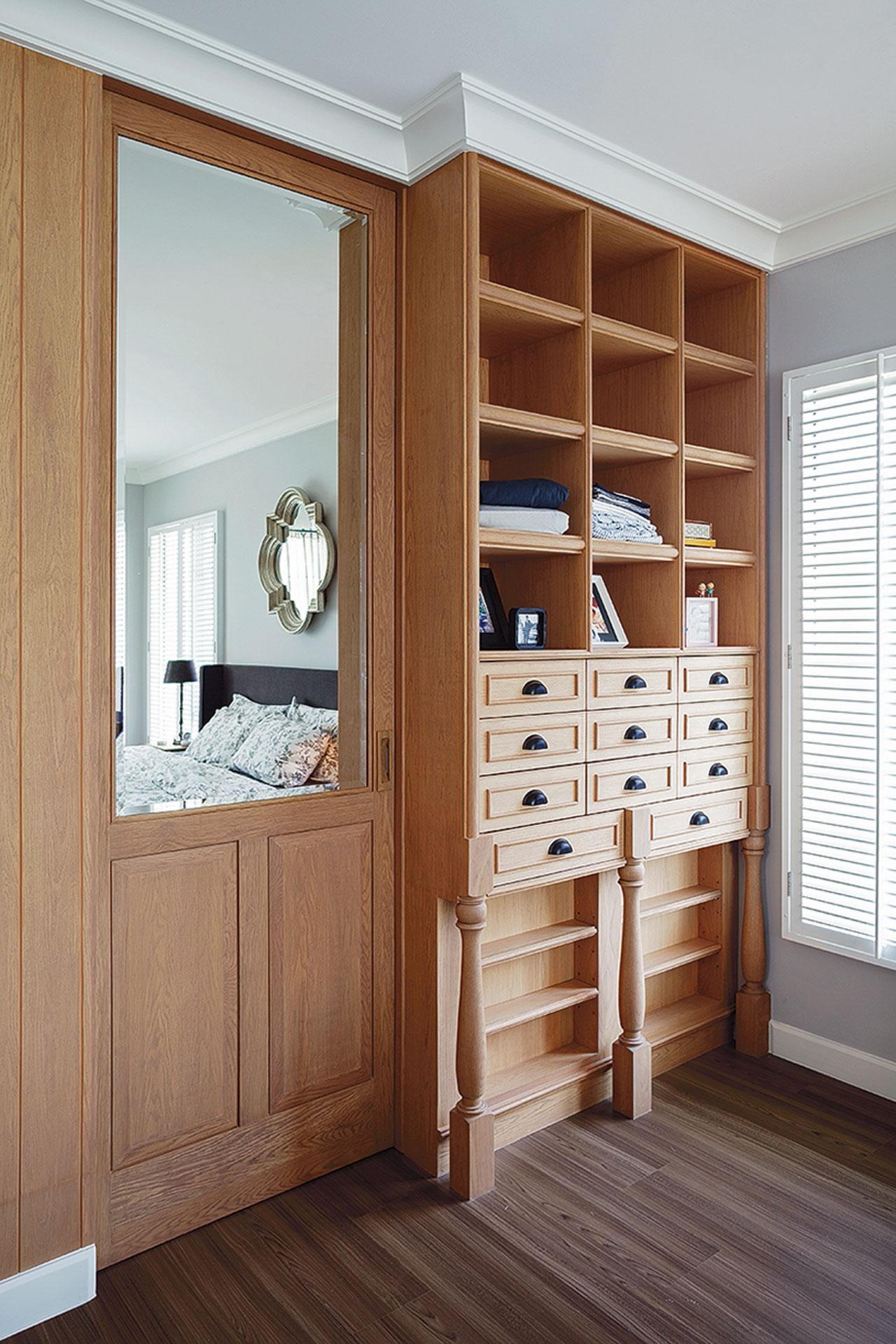 เราชอบไอเดียการจัดเก็บของบ้านนี้ ที่ออกแบบหน้าบานตู้เป็นลิ้นชัก ที่เหมือนนำกระเป๋าเดินทางมาซ้อนกัน ข้อดีของตู้บิวท์อินแบบนี้คือ สามารถแยกประเภทการจัดเก็บได้สะดวกดี อาจติดป้ายเล็กๆ บอกประเภทของด้านใน ก็ทำให้จัดเก็บและหยิบใช้ได้ง่ายขึ้น