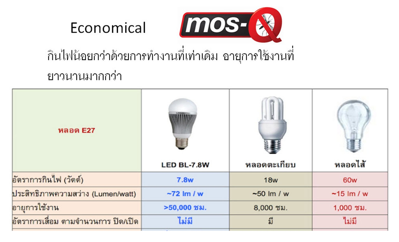 MOSQ ECO TRAP ถูกพัฒนาจากรุ่นเดิม ให้สวยกว่า สว่างกว่า ประหยัดไฟมากกว่า อายุการทำงานของหลอดไฟยาวนานกว่า ใช้งานสะดวก และเปี่ยมไปด้วยประสิทธิภาพการปกป้องท่านจากยุงร้าย.....เพราะชีวิตสำคัญอย่ารอจนสายไป ป้องกันตั้งแต่วันนี้.