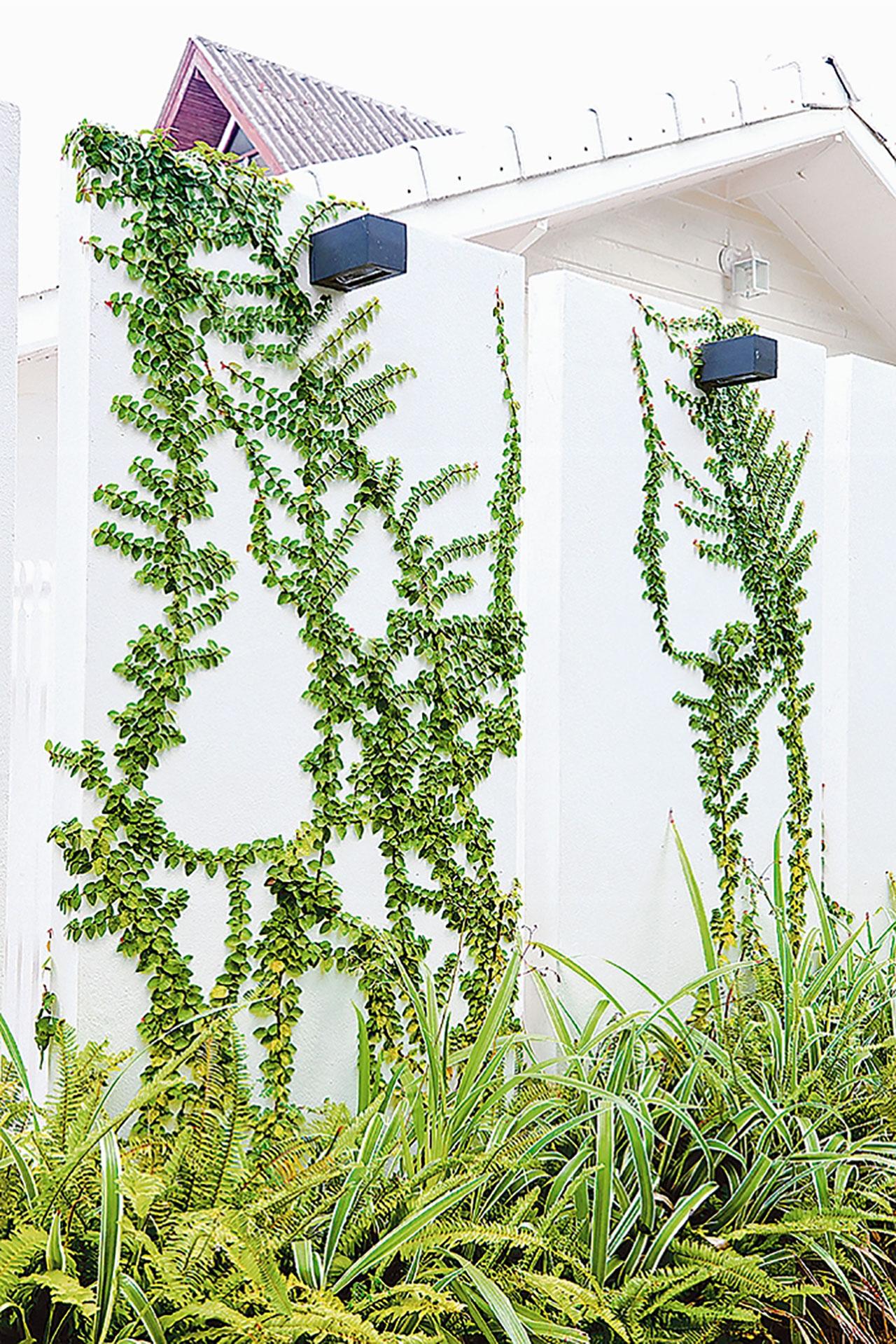 14 - เติมสีเขียวให้อาคาร ด้วยไม้เลื้อย นอกจากการทำสวนในที่แคบแล้ว การสร้าง“พื้นผิวสีเขียว” ก็เป็นส่วนหนึ่งในการสร้างความเป็นธรรมชาติให้ตัวอาคารในงบประมาณที่ไม่สูง แต่อาจต้องการการดูแลสักเล็กน้อย การเลือกใช้ไม้เลื้อยนั้นสามารถประยุกต์ได้หลากหลาย ไม่ว่าจะปล่อยให้เกาะเลื้อยไปตามผนังหรือตามโครงที่กำหนดไว้ และบางครั้งอาจกำหนดให้ไม้เลื้อยห้อยระย้าลงมาจากด้านบนก็ยังได้ เช่น พื้นที่สำหรับวางคอมเพรสเซอร์แอร์ที่ชั้นสองใช้เป็นพื้นที่ปลูกกระถางไม้เลื้อยที่ปล่อยให้ห้อยระย้าลงไปเพื่อช่วยบังแดดให้ห้องชั้นล่าง ได้ทั้งความสบายและทัศนียภาพสวยงามไปพร้อมกัน