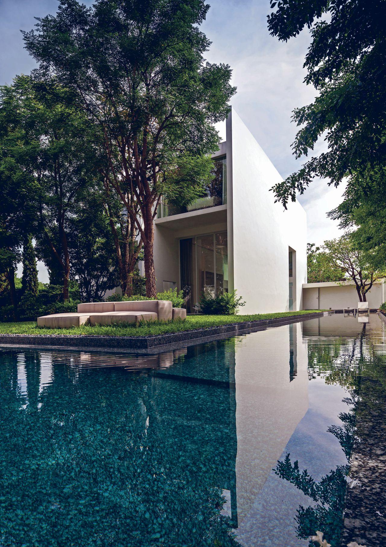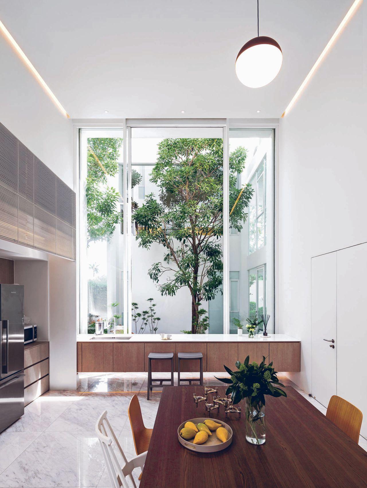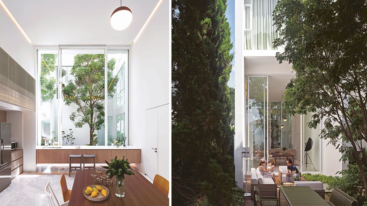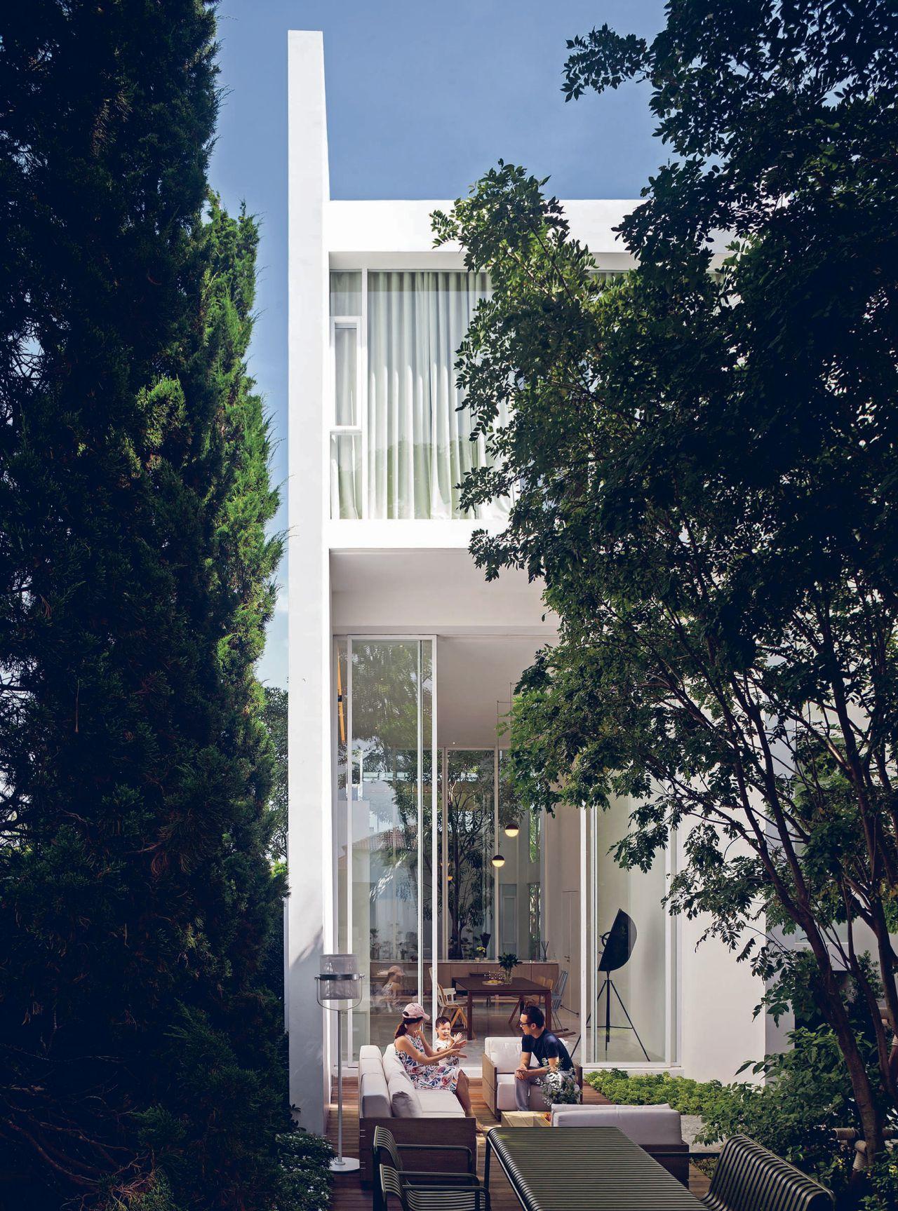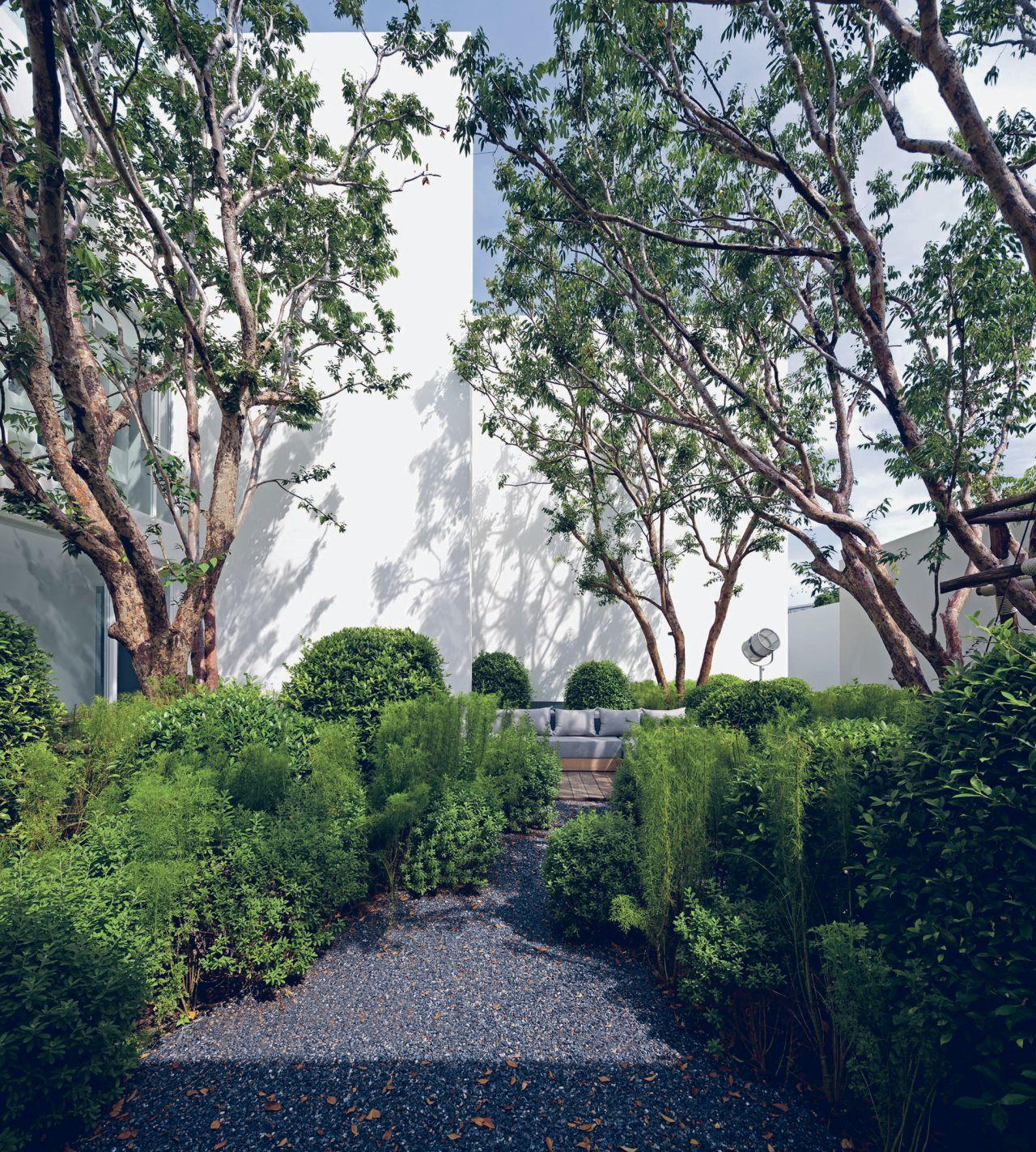 ขณะเดียวกันด้วยลักษณะอาคารที่สูงตามแนวตั้งของกำแพง ยังเอื้อให้เกิดการสร้างสเปซแบบ “คอร์ตยาร์ด” ภายใน ซึ่งทำหน้าที่ดึงแสงและอากาศที่ปลอดโปร่งเข้ามาสู่ห้องต่าง ๆ แถมยังเชื่อมไปสู่สวนป่าหลังบ้าน สวนขนาดใหญ่ที่คั่นกลางระหว่างตัวบ้านกับแนวรั้วเพื่อให้ต้นไม้ช่วยบังแดดยามบ่าย และใช้เป็นพื้นที่นั่งเล่นหรือจัดปาร์ตี้ มีแลนด์สเคปเป็นสระว่ายน้ำรูปตัวแอล (L) และระเบียงไม้กลมกลืนไปกับต้นไม้สูงใหญ่ที่ตั้งใจปลูกให้กระจายอย่างอิสระ