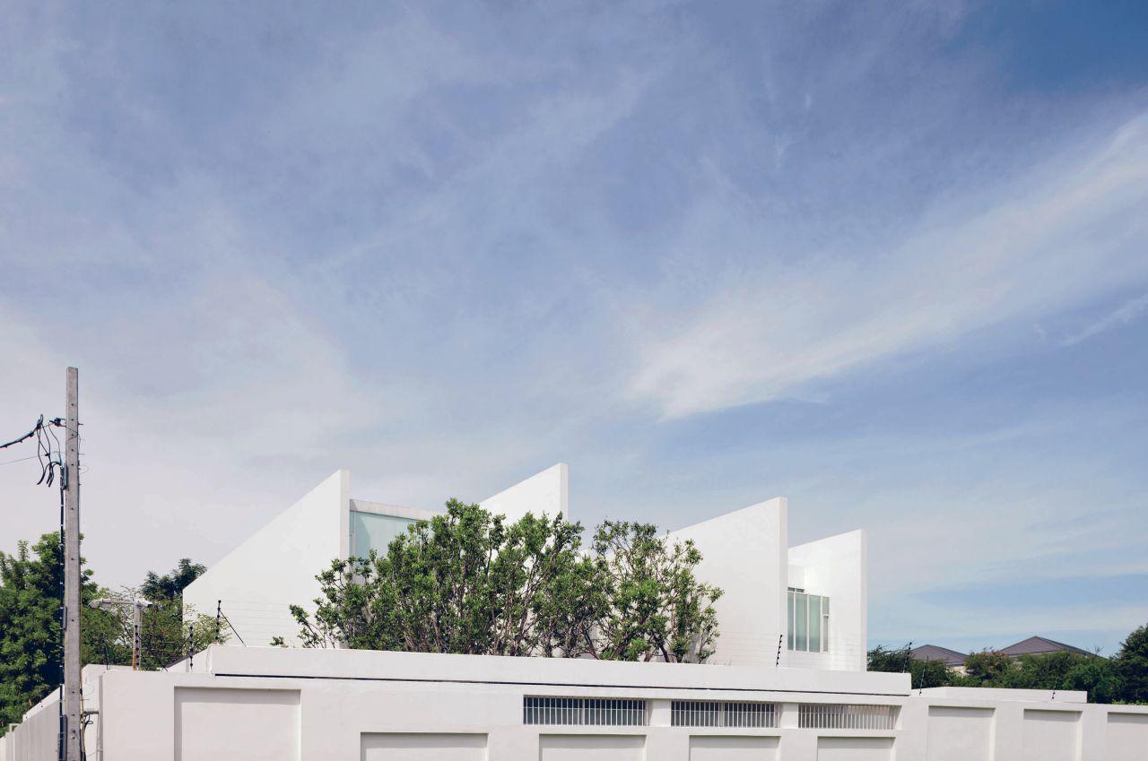 ภาพกำแพงสีขาวสูงจรดฟ้าของบ้านหลังนี้คือส่วนหนึ่งของสถาปัตยกรรมชิ้นใหญ่ที่โดดเด่นแม้จะมองจากที่ไกล นี่คือบ้านหลังใหม่ของคุณป๊อก-อรรถพร คบคงสันติ ภูมิสถาปนิกและเจ้าของสำนักงานภูมิสถาปัตยกรรม T.R.O.P. ที่ได้คุณบุญเลิศ เหมวิจิตรพันธ์ สถาปนิกจากสำนักงานออกแบบ BoondesignStudio มาทำหน้าที่ร่างเส้นสาย จากความต้องการที่เจ้าของบ้านได้บอกเล่ากับสถาปนิกในที่สุดก็มาลงตัวด้วยการใช้ “กำแพงสีขาว” มาเป็นเครื่องมือหลักในการออกแบบ “บ้านหลังนี้ไม่ได้เริ่มจาก “ห้อง” แต่เริ่มจากการมีกำแพงขนาดใหญ่ตั้งขนานกัน จากนั้นจึงค่อยย่อยสเปซภายในให้กลายเป็นพื้นที่ใช้งานต่างๆ เรียกว่างานชิ้นนี้เกิดขึ้นจาก ‘Series of Wall’ ”