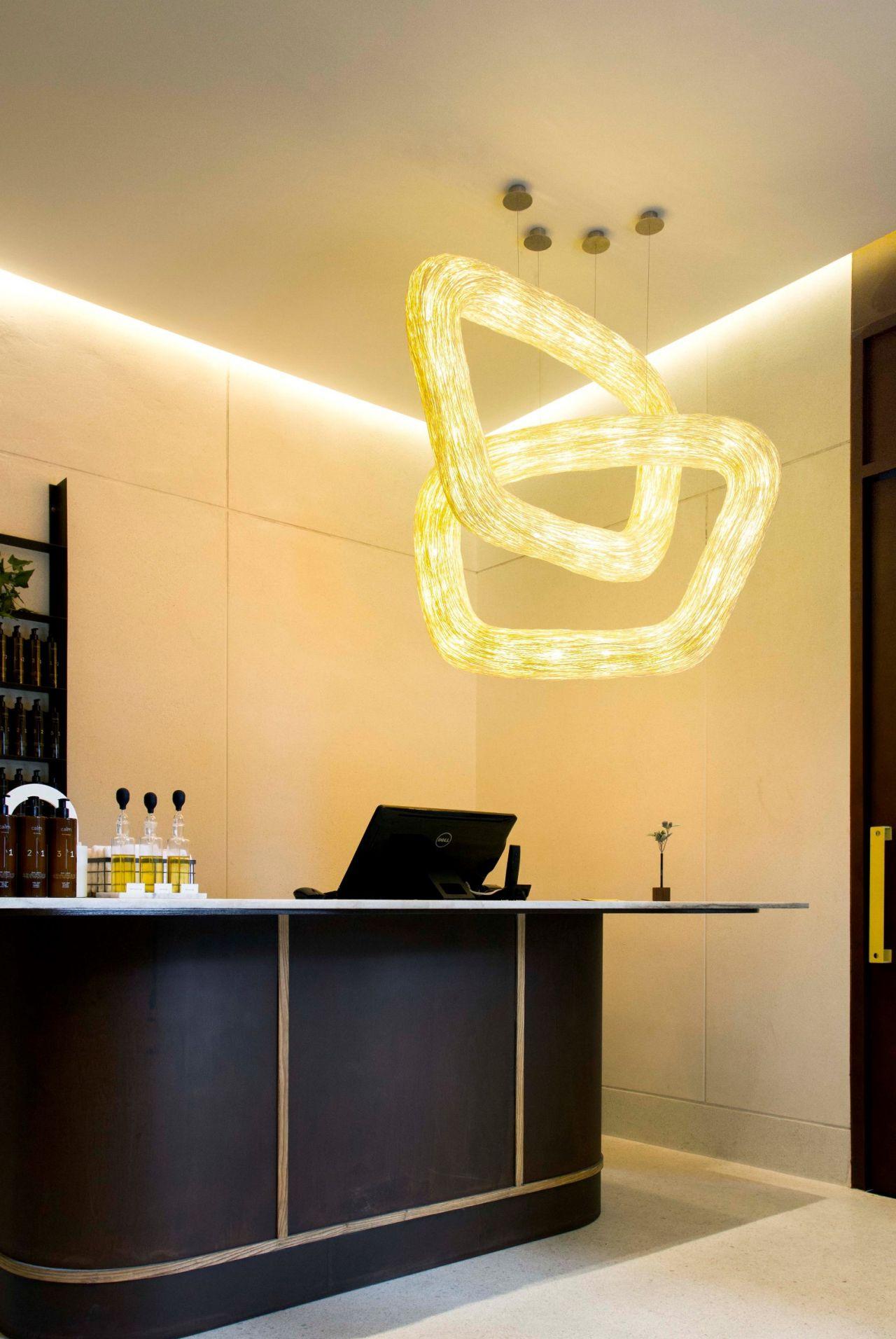 โคมไฟผลิตจากหวาย สานกันแบบอิสระ รูปทรงลักษณะเป็นแหวนฟรีฟอร์ม คล้องกัน 2 วง แสงสว่างเกิดจากหลอด LED G9 จาก แองโก (ANGO) แบรนด์โคมไฟงานแฮนด์เมดทำจากวัสดุธรรมชาติ อาทิ หวาย รังไหม เยื่อสา โคมไฟดีไซน์ทันสมัย มีกระบวนการผลิตที่เป็นเอกลักษณ์ โดยมี แองกัส ฮัทชิสัน (Angus Hutcheson) ชาวอังกฤษเป็นนักออกแบบ