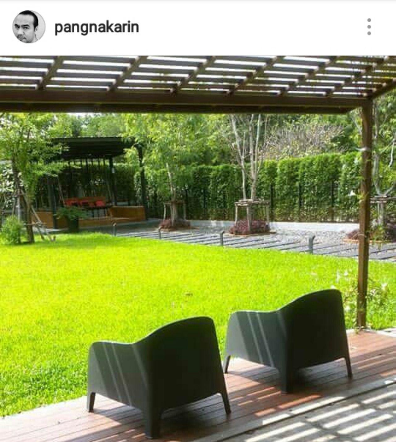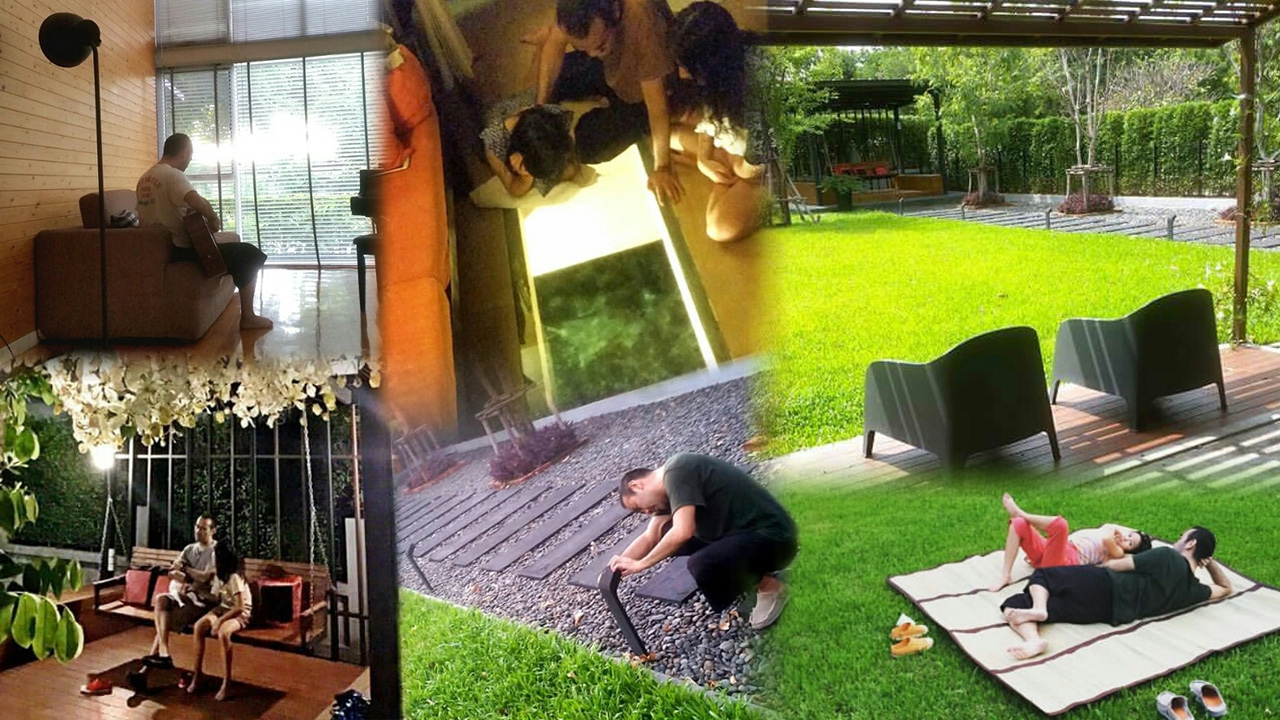 สำหรับบ้านหลังนี้ก็มีพื้นที่พอสมควร มีสนามหญ้าสีเขียวสด สร้างความสดชื่นให้กับคนอยู่อาศัยมากๆ มีมุมนั่งเล่น มุมปูสื่อนอน มุมดูปลา ซึ่งพิเศษกว่าที่ไหน เพราะมีปลาว่ายน้ำอยู่ใต้พื้นบ้านด้วยจ้า