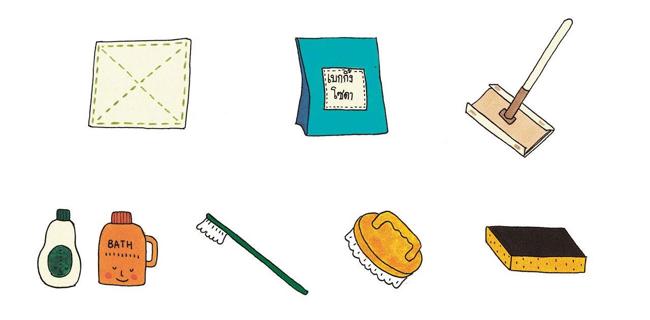 ผ้าขี้ริ้ว - เบกกิ้งโซดา - ไม้ดันฝุ่น - น้ำยาทำความสะอาด และน้ำยาล้างห้องน้ำ - แปรงสีฟันเก่า - แปรงขัดห้องน้ำ - ฟองน้ำ