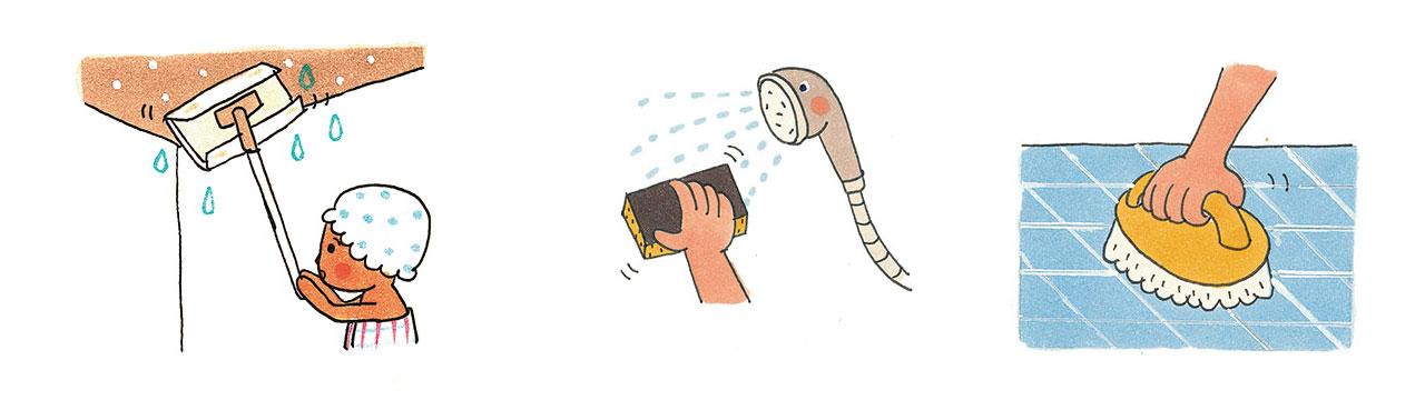 บริเวณผนังและพื้นให้เปิดน้ำอุ่น จากฝักบัวแล้วล้างคราบสกปรก ออกด้วยฟองน้ำ เมื่อขัดเสร็จแล้ว ราดด้วยน้ำเย็นซ้ำอีกครั้ง เพื่อให้ อุณหภูมิลดลงเป็นการช่วยป้องกันเชื้อรา