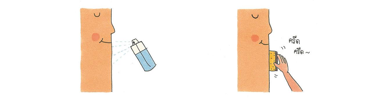 หากคราบบริเวณผนังเริ่มฝังแน่น ให้ใช้เบกกิ้งโซดา 4 ช้อนโต๊ะ ผสมน้ำ 1 ลิตร ฉีดลงบนผนัง