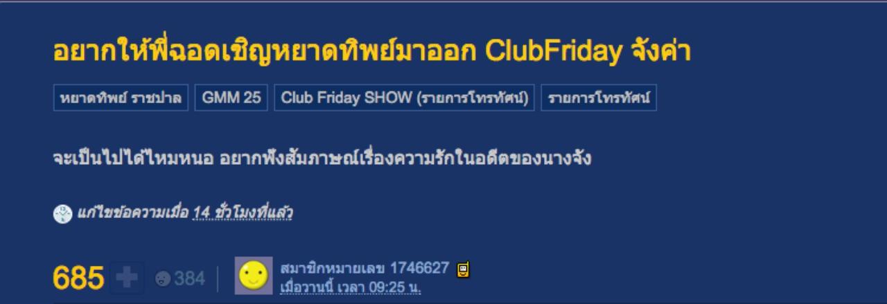 1. เริ่มต้นด้วยแฮชแท็กที่กำลังเป็นประเด็นร้อนตอนนี้ #ป้าซุ่มทุ่มไม่อั้น ที่นักสืบโซเชียลทั้งหลายพยายามขุดคุ้ยเรื่องราวความรักส่วนตัวของ พี่ฉอด สายทิพย์ มนตรีกุล ณ อยุธยา ซึ่งเริ่มต้นเหตุการของแฮชแท็กนี้เกิดขึ้นมาจากชาวเน็ตหมั่นไส้แอดมินเพจ Club Friday The Series จากการสร้างกระแสพิชญ์-โฟร์ จนถึงขนาดมีคนไปตั้งกระทู้ในพันทิป