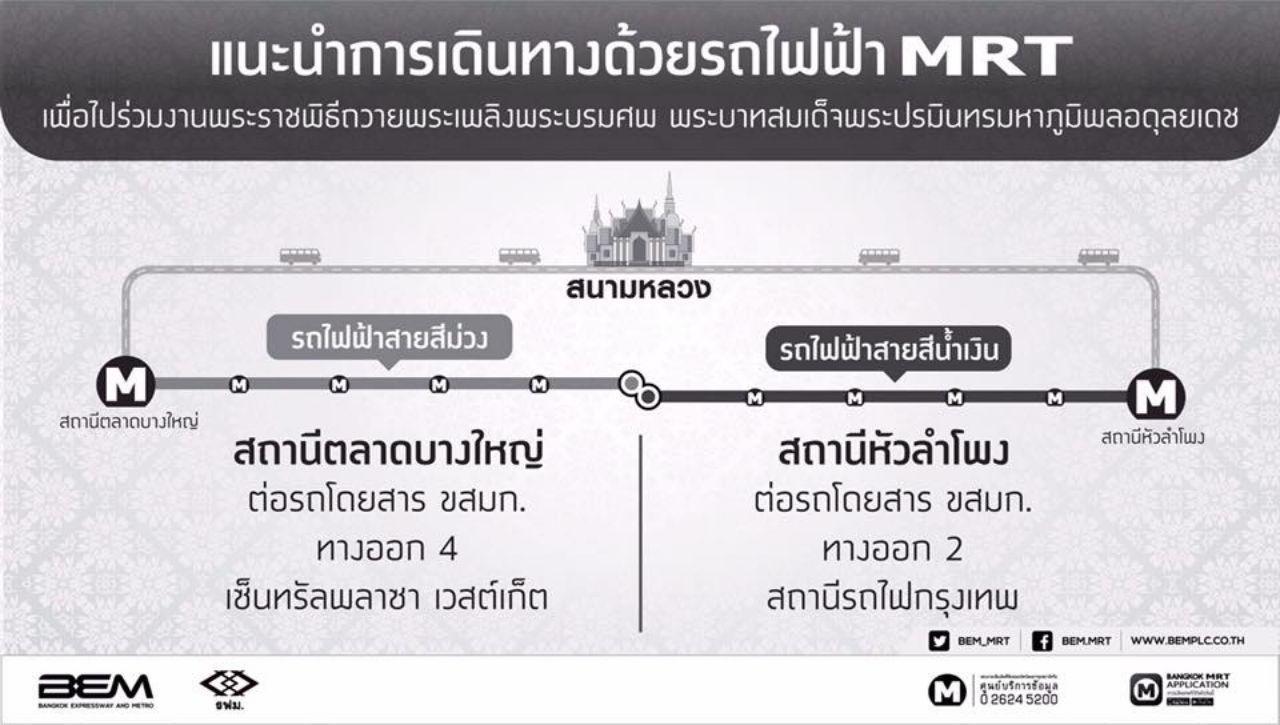 MRT เปิดให้บริการรถไฟฟ้าฟรี เพื่ออำนวยความสะดวกให้กับประชาชนที่เดินทางในช่วงงานพระราชพิธีถวายพระเพลิงพระบรมศพ