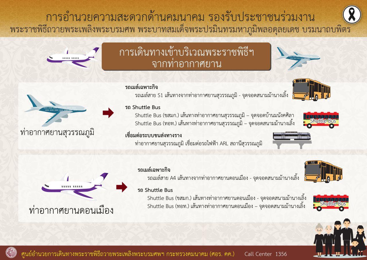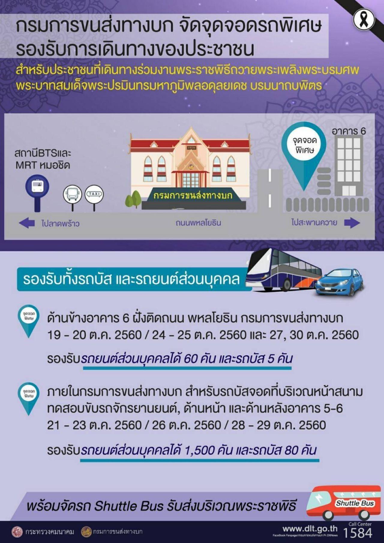 โดยประชาชนที่เดินทางมาทางถนน จะมีรถประจำทางสายปกติบริการฟรี 25 เส้นทาง จำนวน 404 คัน ส่วนรถปรับอากาศ มีจำนวน 238 คัน ซึ่งเก็บค่าโดยสารปกติ ขณะรถ Shuttle Bus บริการ 21 เส้นทาง จำนวน 490 คัน บริการฟรีตลอด 24 ชม. ออกทุกๆ 10 นาที คาดว่า จะสามารถรองรับประชาชนที่ทยอยเดินทางเข้ามาในวันที่ 26 ต.ค. จำนวน 578,770 คน จำนวน 4,950 เที่ยว ยังได้ประสานกรมการขนส่งทางบก ให้จัดหารถโดยสารไม่ประจำทาง จัดเพิ่มเป็น Shuttle Bus กรณีไม่เพียงพอ และเตรียมรถเช่าเหมา กรณีรถ ขสมก.ไม่เพียงพอเช่นกัน พร้อมตรวจสภาพรถ-คนขับ