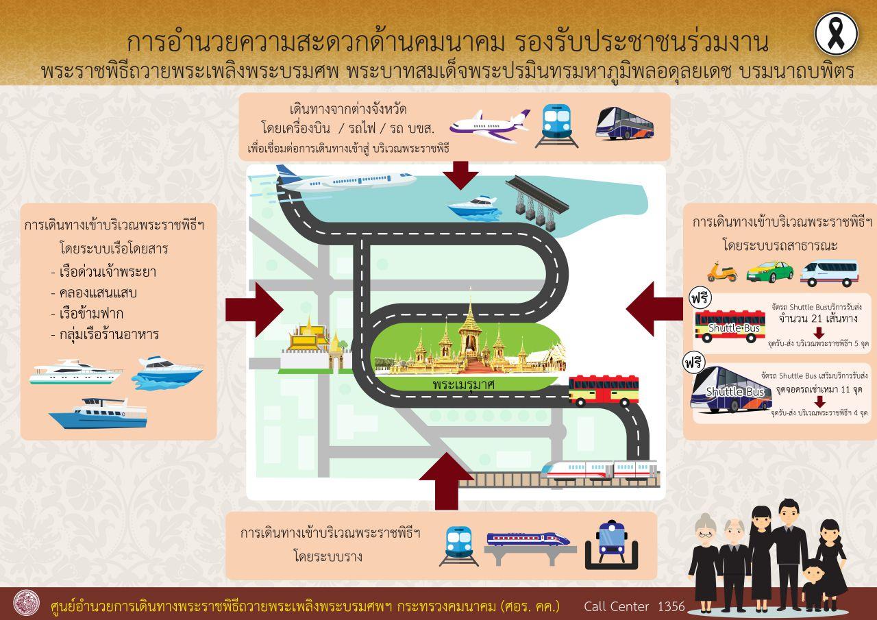 กระทรวงคมนาคม จัดรถ รับ-ส่ง ประชาชนทั่วประเทศมาบริเวณงานพระราชพิธีถวายพระเพลิงพระบรมศพ ใน 5 จุด จอดรถที่กำหนด คือ 1. แยกอรุณอมรินทร์ 2. สนามม้านางเลิ้ง 3. แยกวิสุทธิกษัตริย์ 4. บ้านมนังคศิลา 5. แยกเมอรี่คิงส์ (เดิมแยกปากคลองตลาด) ทั้ง ทางบก ทางเรือ และทางอากาศ โดยจะเน้นเรื่องความสะดวก ความปลอดภัย รวมถึงแผนเผชิญเหตุ แผนฉุกเฉิน