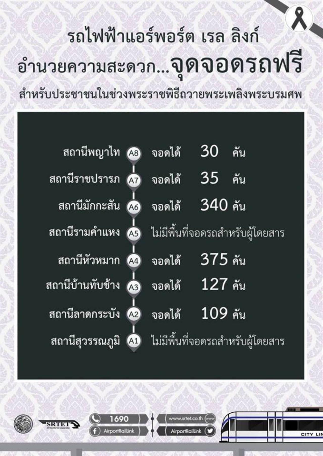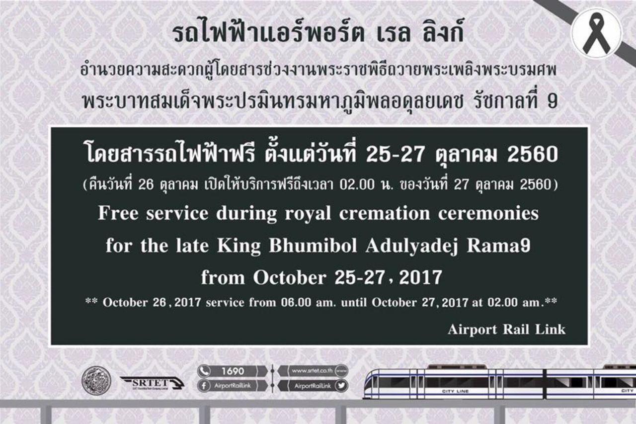 อำนวยความสะดวกช่วงงานพระราชพิธีถวายพระเพลิงพระบรมศพ พระบาทสมเด็จพระปรมินทรมหาภูมิพลอดุลยเดช รัชกาลที่ 9 ซึ่งผู้โดยสารรถไฟฟ้าแอร์พอร์ตเรลลิงก์ ฟรี ตั้งแต่วันที่ 25 - 27 ต.ค. 2560 (คืนวันที่ 26 ต.ค. เปิดให้บริการฟรีถึงเวลา 02.00 น. ของวันที่ 27 ต.ค.2560)