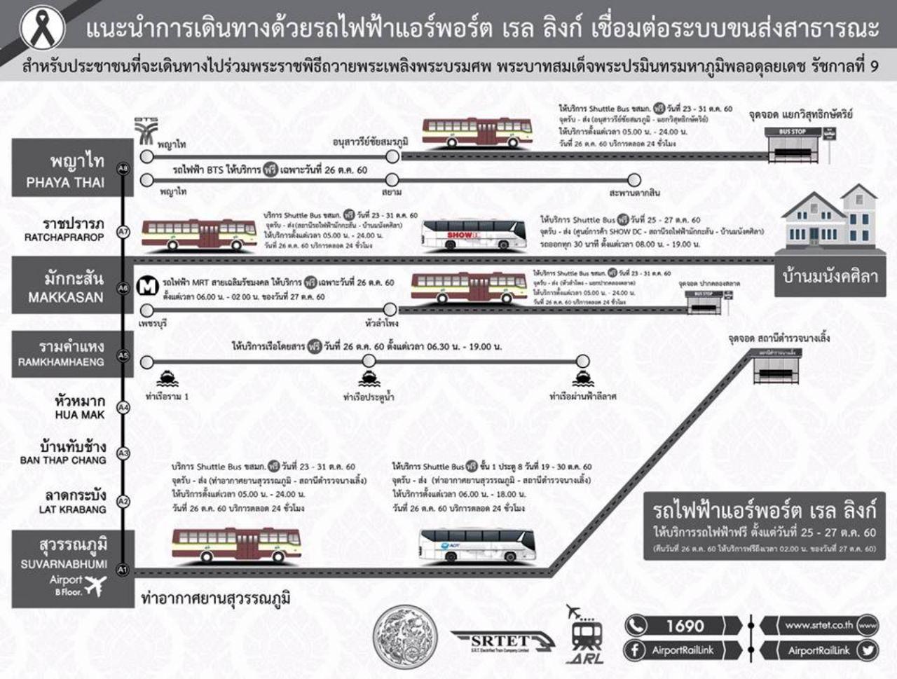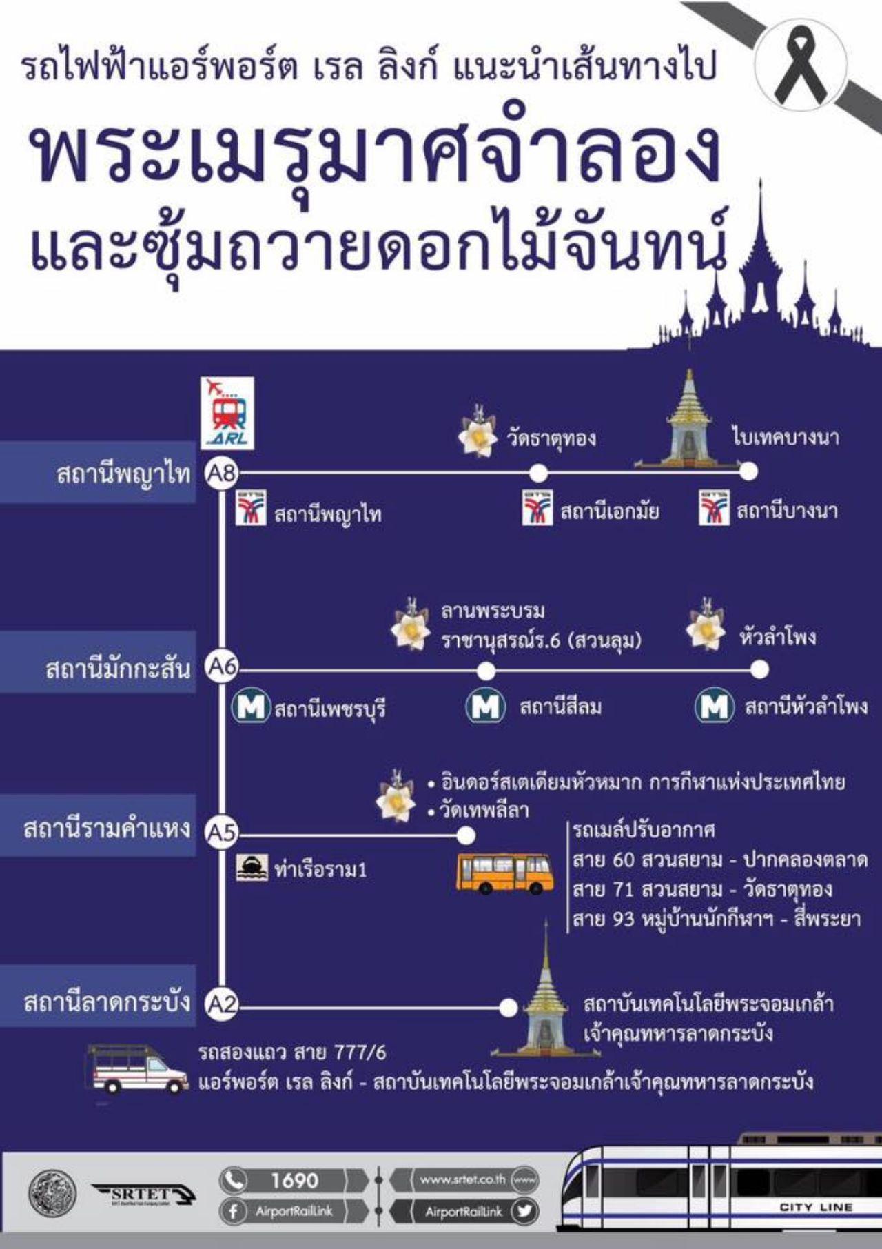 นอกจากนั้นรถไฟฟ้าแอร์พอร์ต เรล ลิงก์ ยังแนะนำเส้นทางไปพระเมรุมาศจำลองและซุ้มถวายดอกไม้จันทน์ ทั้งยังอำนวยความสะดวก จุดจอดรถฟรี สำหรับประชาชนในช่วงพระราชพิธีถวายพระเพลิงพระบรมศพ