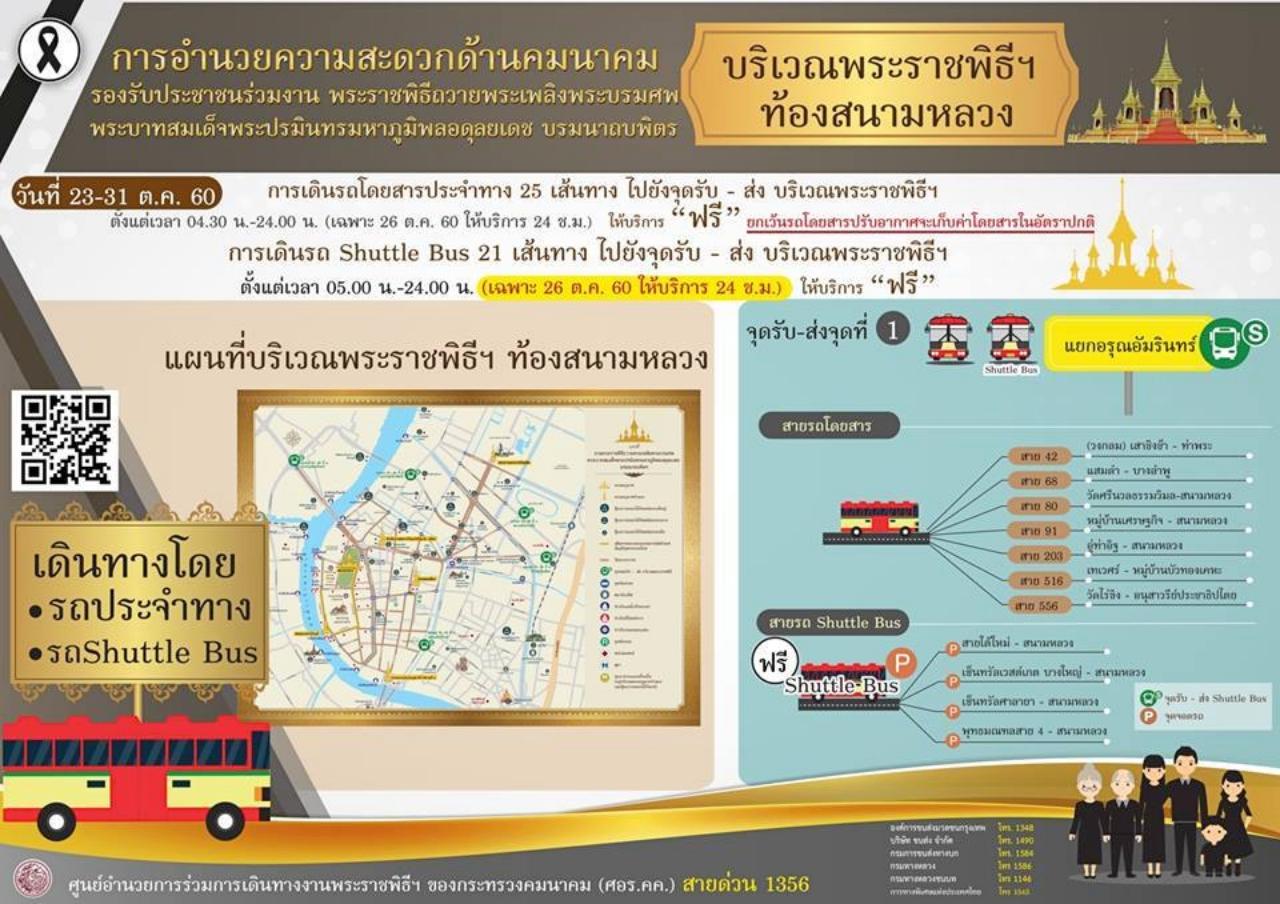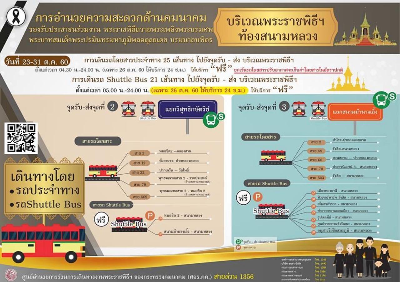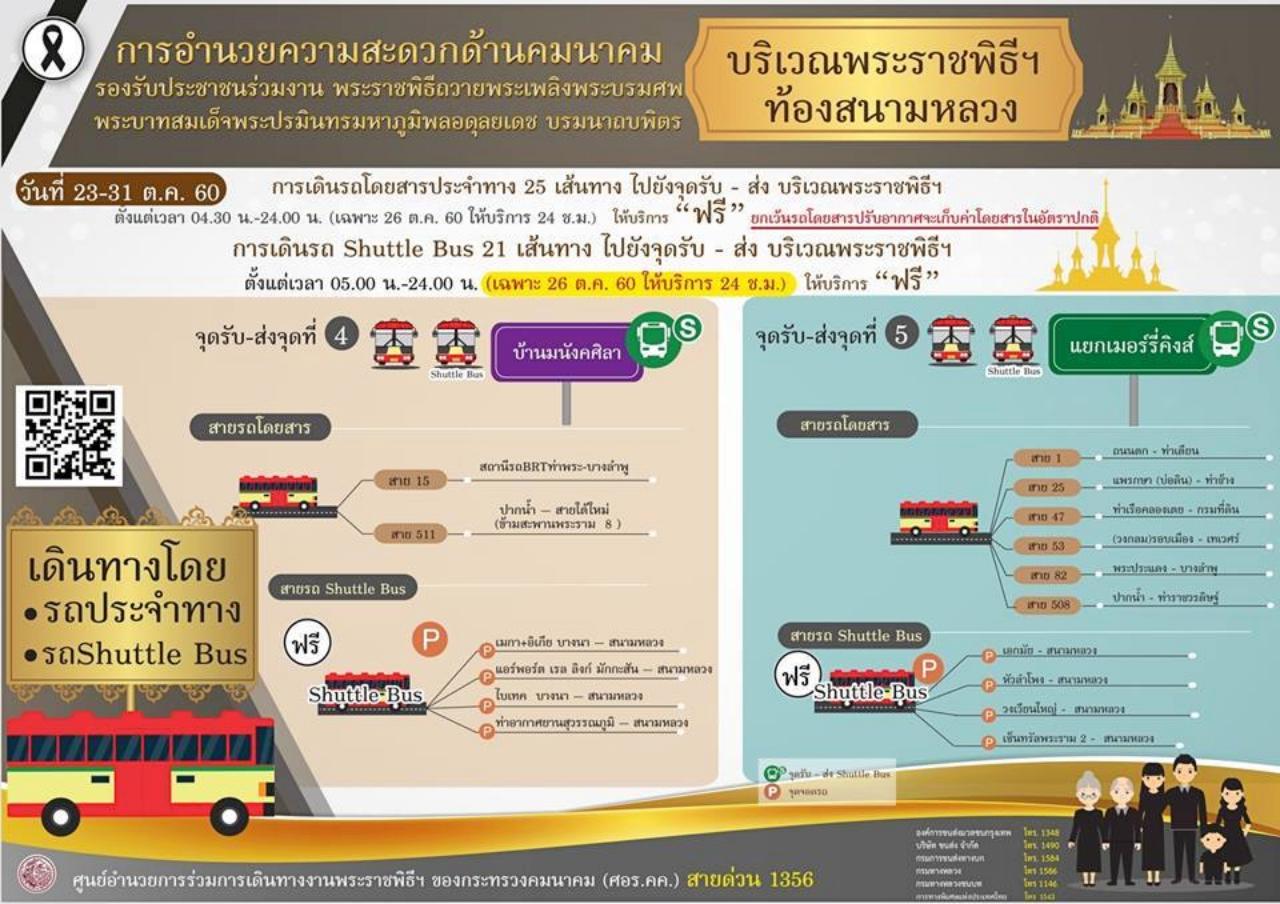 ขอให้ทำความเข้าใจก่อนว่า ในวันงานพระราชพิธีถวายพระเพลิงพระบรมศพ 26 ต.ค. 2560 จะมีการปิดถนนหลายสาย กินพื้นที่เป็นบริเวณกว้าง ประชาชนจะไม่สามารถนั่งรถเข้าไปยังสนามหลวงได้โดยตรง แต่จะมีจุดจอดให้รถ Shuttle Bus รับส่งประชาชนฟรี 5 จุด รอบๆ สนามหลวง ได้แก่