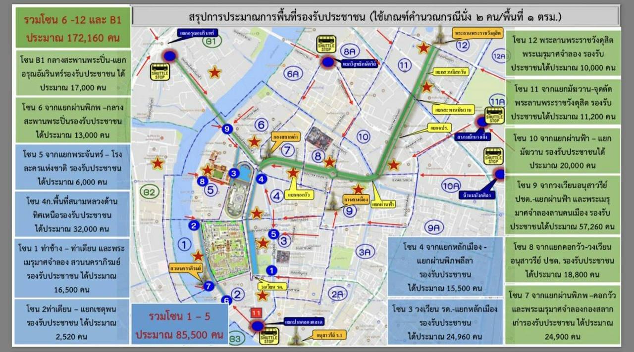 - พื้นที่ทางเท้าฝั่งตรงข้ามพระบรมมหาราชวัง ด้าน ถ.มหาราช ตั้งแต่แยกท่าช้าง ถึง ท่าเตียน และพระเมรุมาศจำลอง สวนนาคราภิรมย์ จุคนได้ประมาณ 16,500 คน