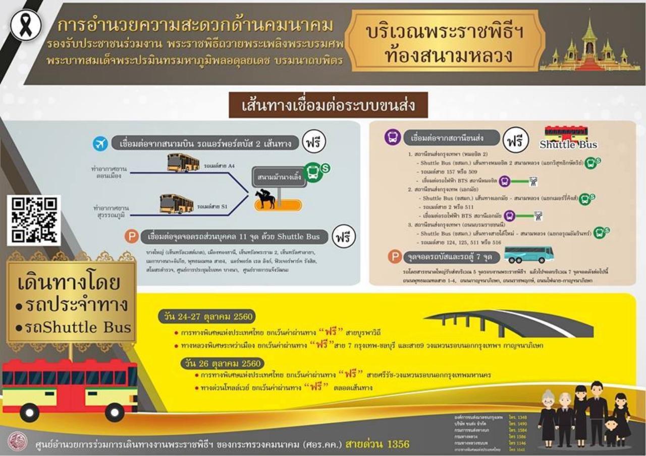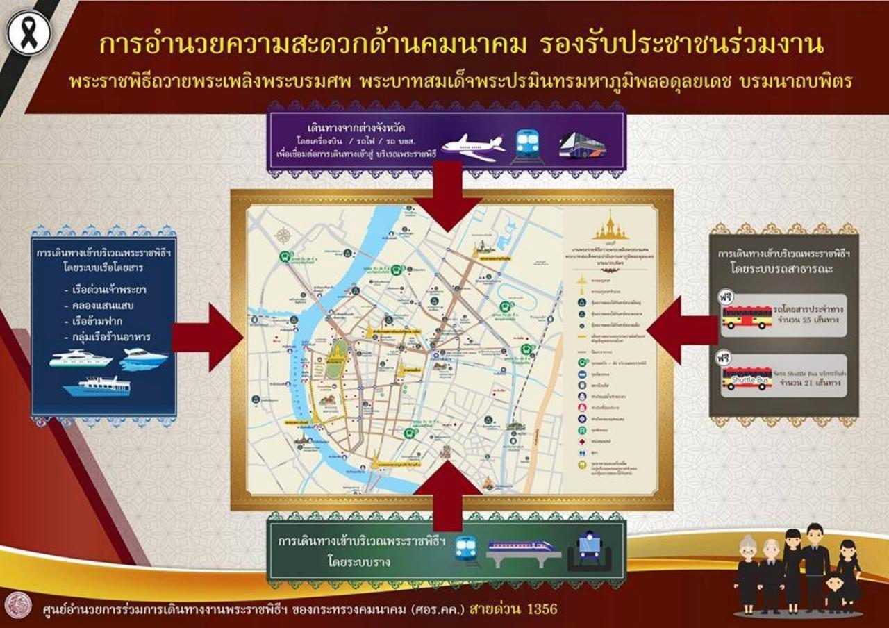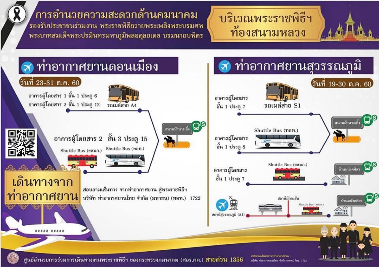 สำหรับประชาชนต่างจังหวัด หรือต่างประเทศ ที่ต้องการเดินทางเข้ามายังกรุงเทพฯ เพื่อร่วมงานพระราชพิธีถวายพระเพลิงพระบรมศพ พระบาทสมเด็จพระปรมินทรมหาภูมิพลอดุลยเดช หากเดินทางมาโดยเครื่องบิน สามารถเดินทางมายังจุดรับส่งรอบๆ สนามหลวง