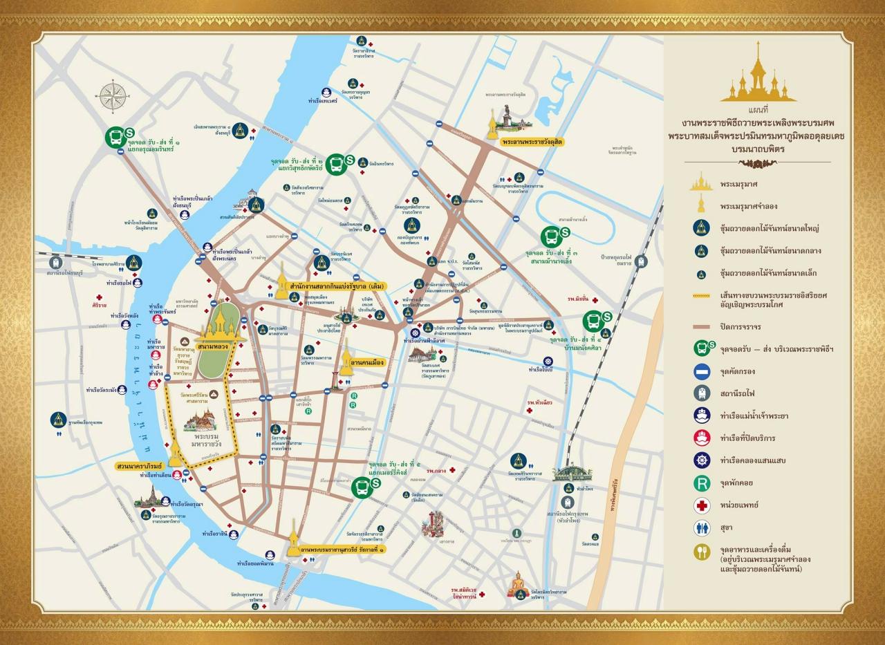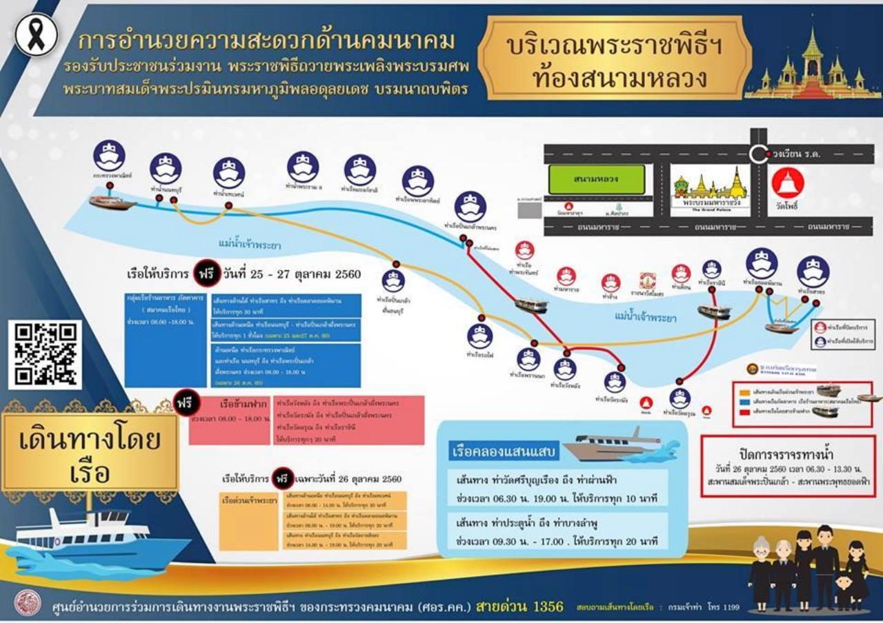 - เดินทางผ่าน ‘แม่น้ำเจ้าพระยา’ (เรือด่วนเจ้าพระยา บริการฟรีเฉพาะวันที่ 26 ต.ค.) จะต้องลงที่ท่าเรือปิ่นเกล้า และท่าเรือยอดพิมานเท่านั้น ก่อนเดินเท้าเข้ามาในงานพระราชพิธีฯ