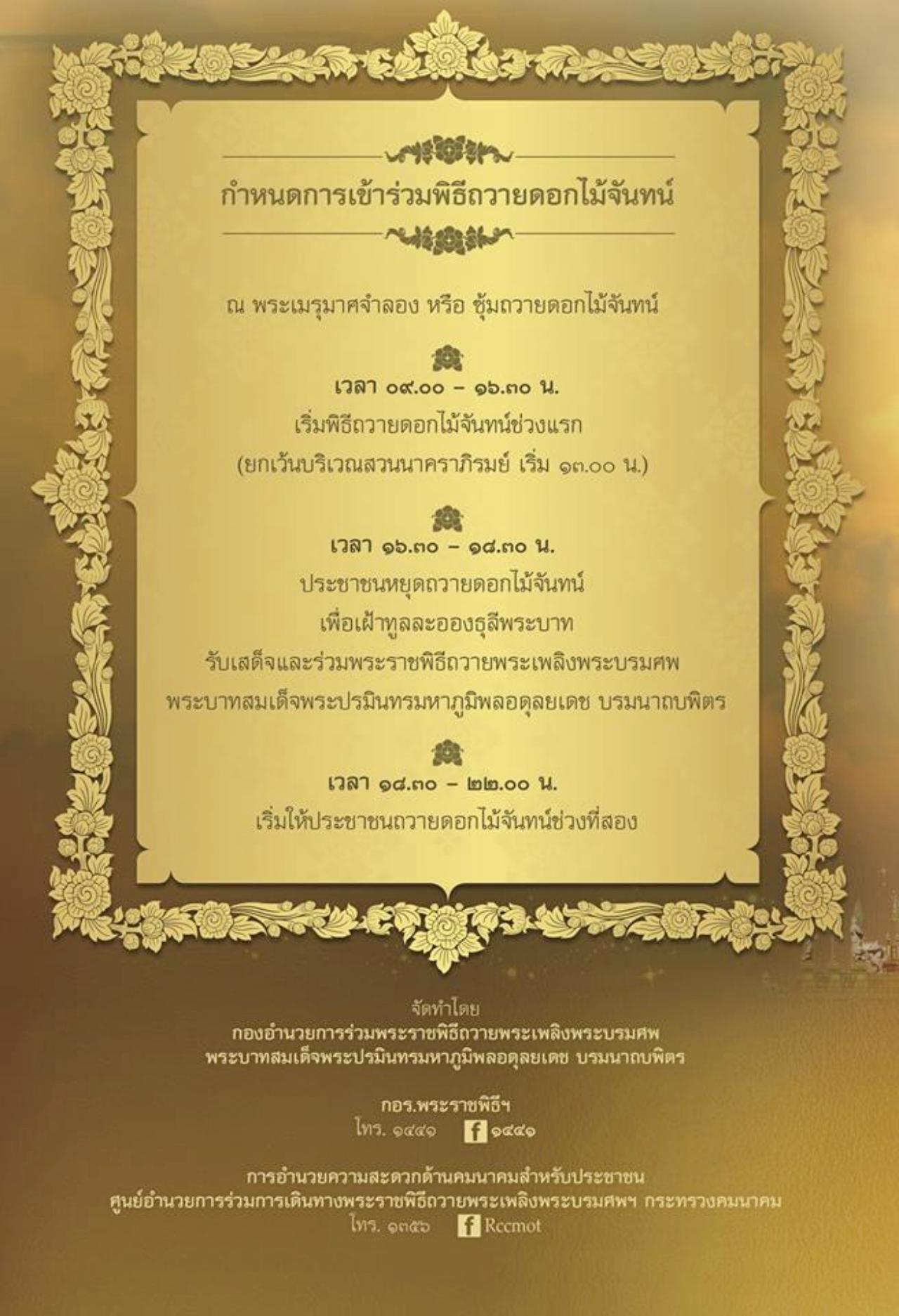 ในเวลา 04.00 น. วันที่ 24 ต.ค.นี้ จะมีการเคลียร์ให้ประชาชนออกจากพื้นที่ เป็นการรักษาความปลอดภัยตามหลักสากล ส่วนวันที่ 25 ต.ค. เวลา 05.00 น. เจ้าหน้าที่จะเปิดให้คนเข้ามาในพื้นที่ ใครมาก่อนก็ให้เข้าก่อน และสามารถนั่งกับพื้นประจำจุดได้ถึงวันที่ 26 ต.ค. 2560 แต่จะไม่ให้กางเต็นท์ ปูเสื่อนอน หากใครที่ลุกออกจากพื้นที่ไป ก็จะเสียสิทธิ์ ดังนั้นขอให้ประชาชนเตรียมตัวให้พร้อม ทั้งอาหาร เครื่องดื่ม ยาดม ยาหม่อง ยาประจำตัว ร่มสีดำ เป็นต้น