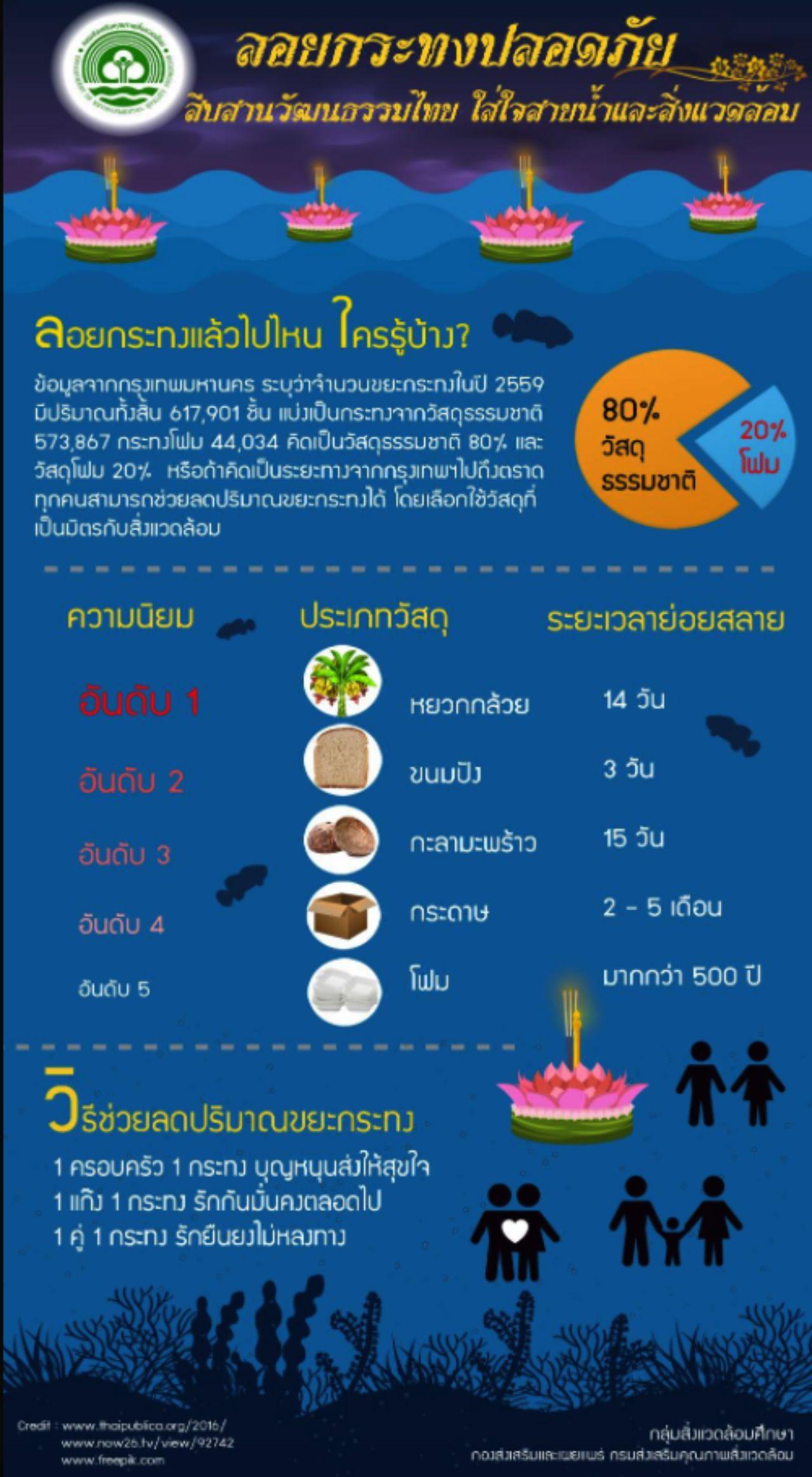 2.หากลอยกระทงในแหล่งน้ำที่ปิด เช่น สระ บ่อ บึง ที่ปลาไม่เยอะ อาจมาใช้กระทงใบตอง หรือวัสดุที่ทำจากธรรมชาติ